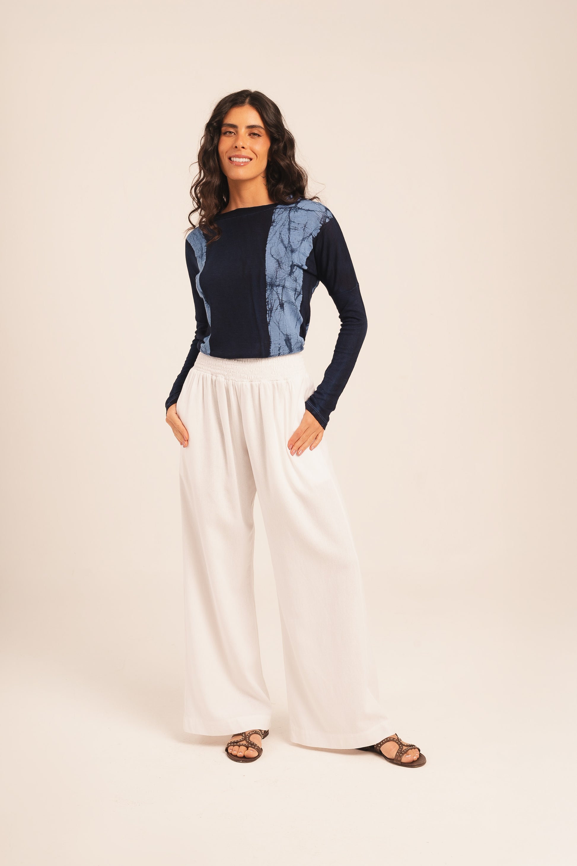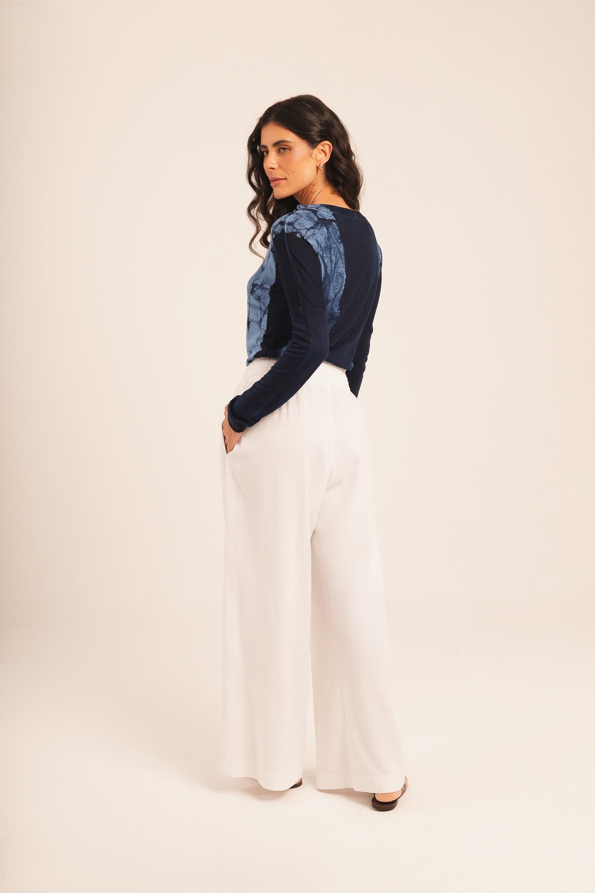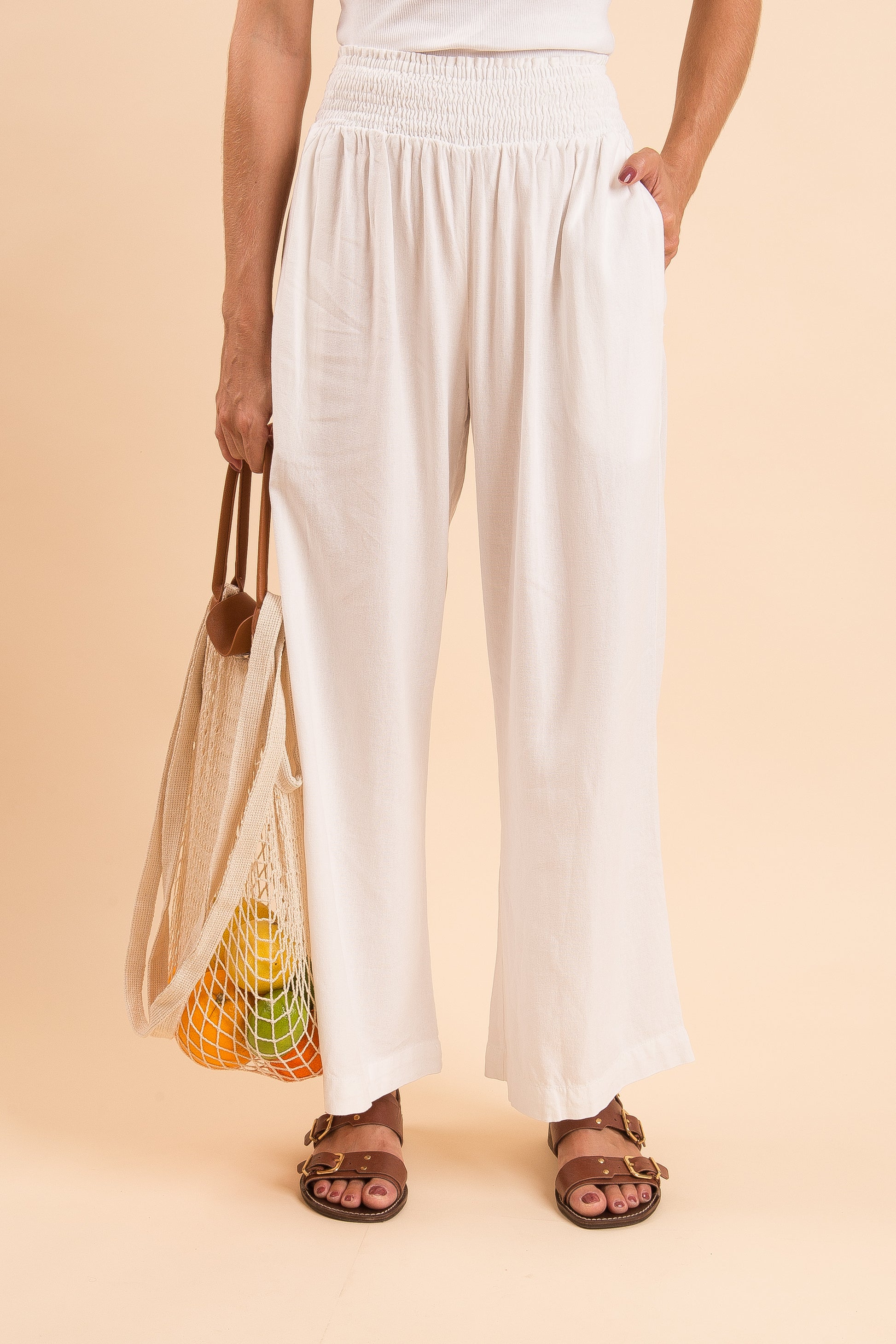 Calça de linho, com elástico na cintura e modelagem ampla.