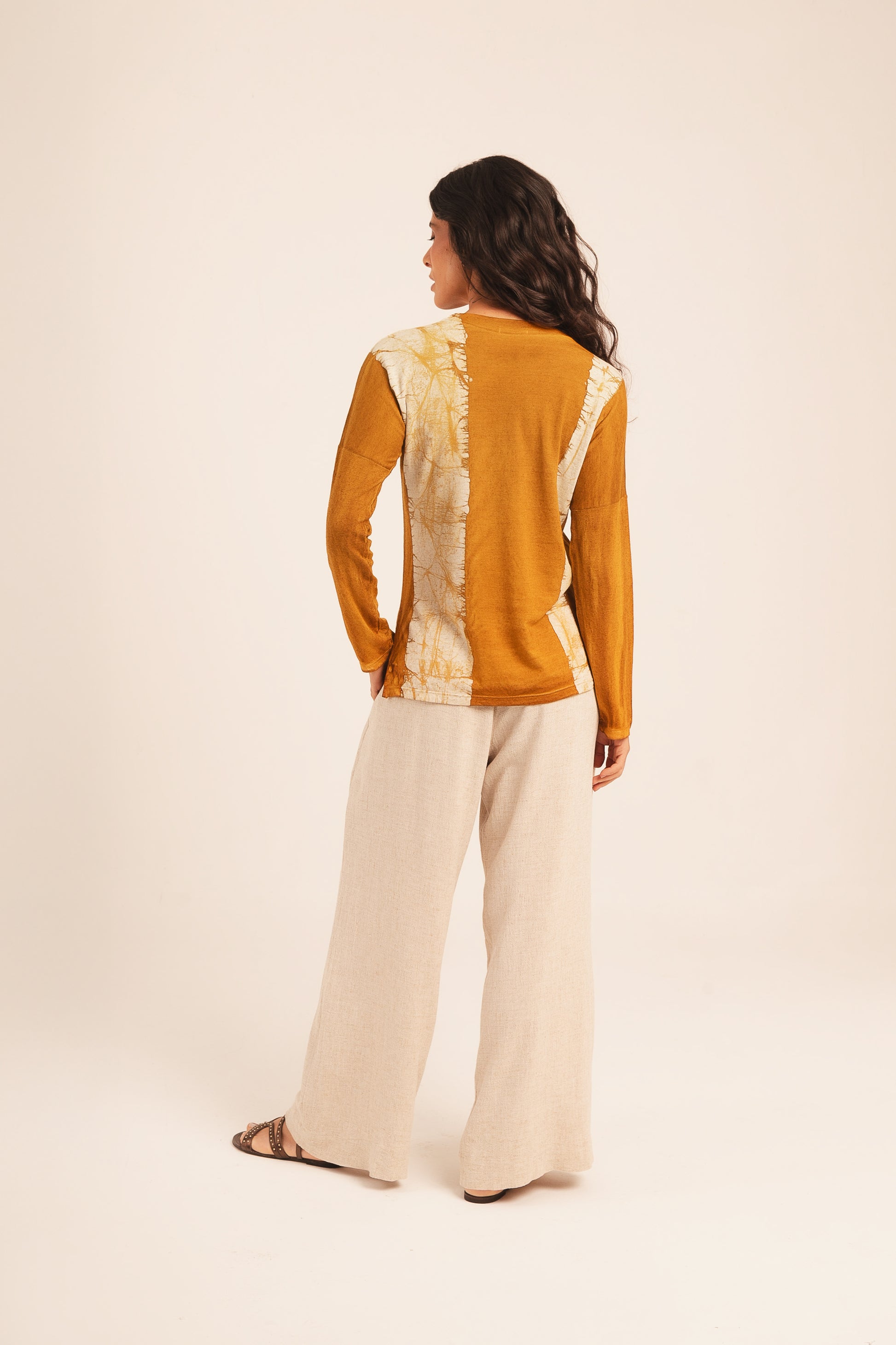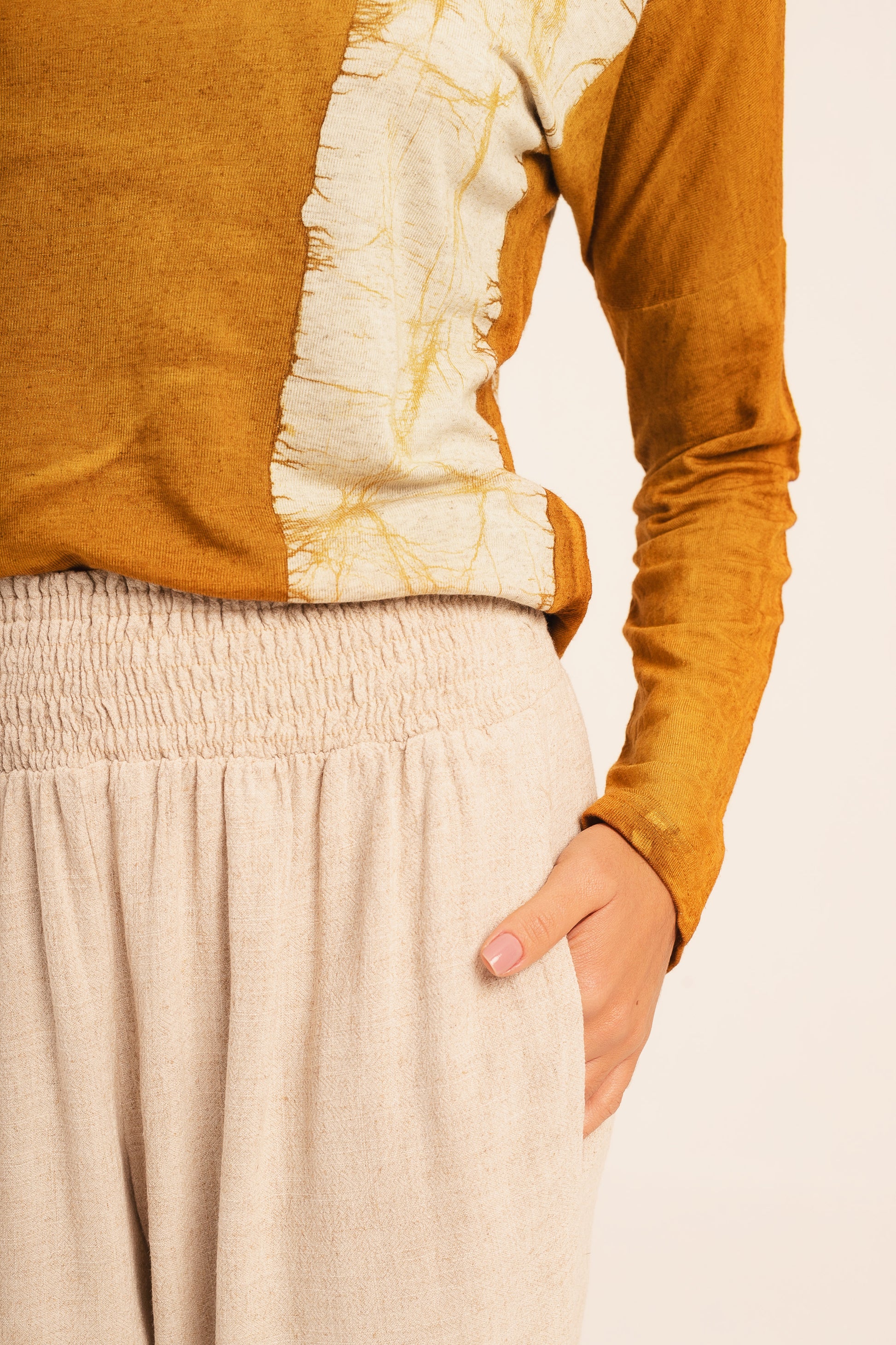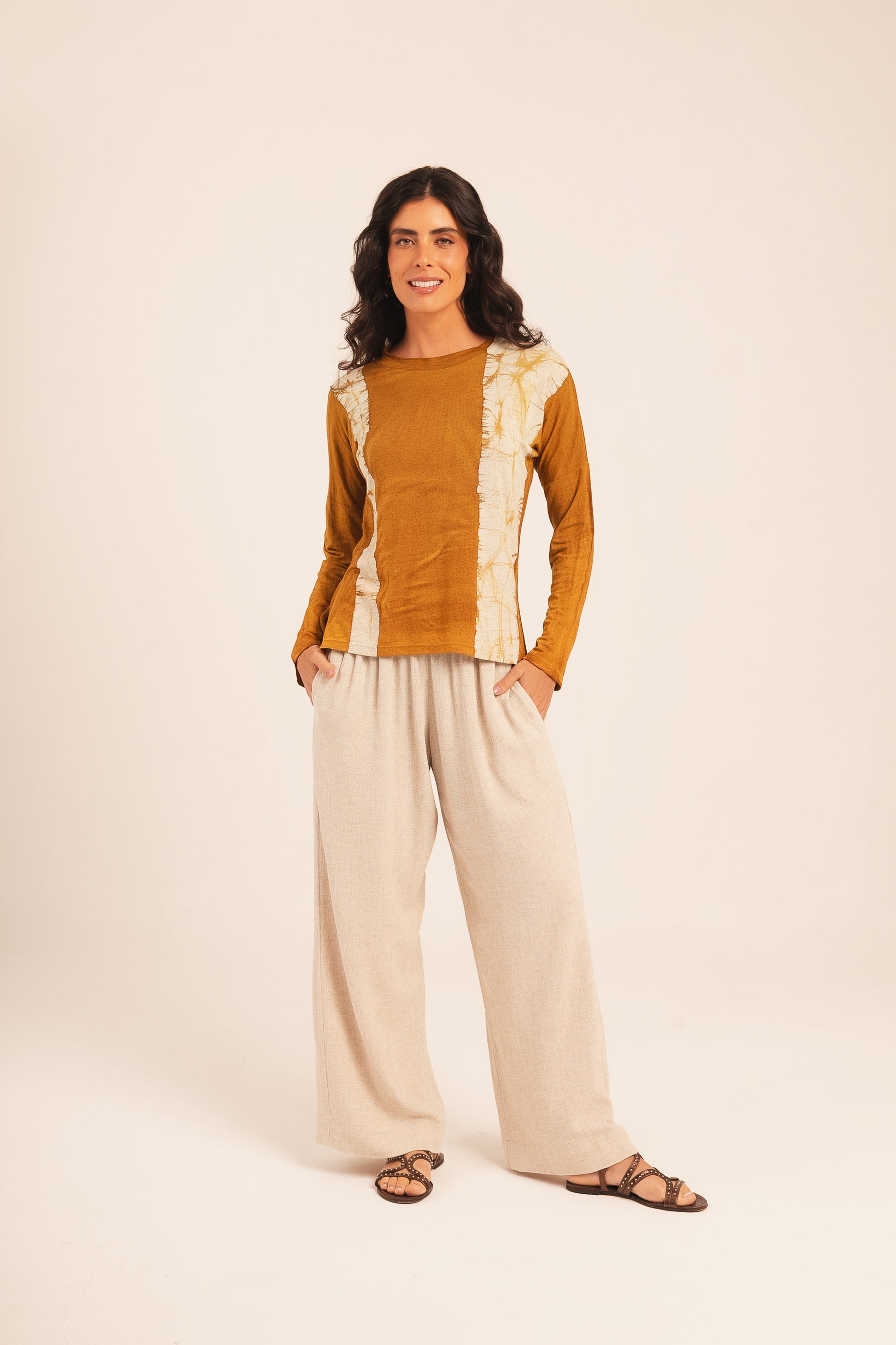 Calça de linho, com elástico na cintura e modelagem ampla.