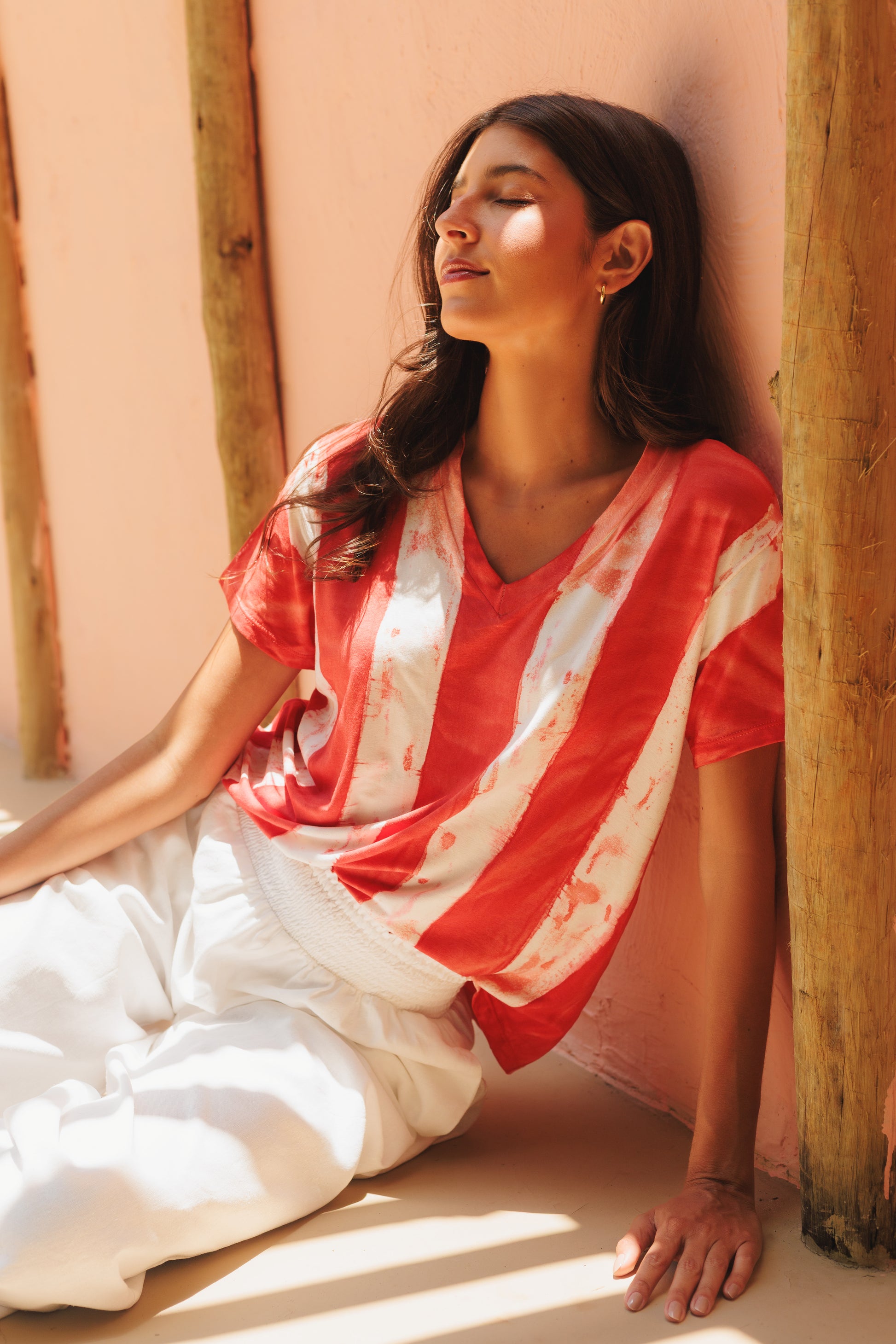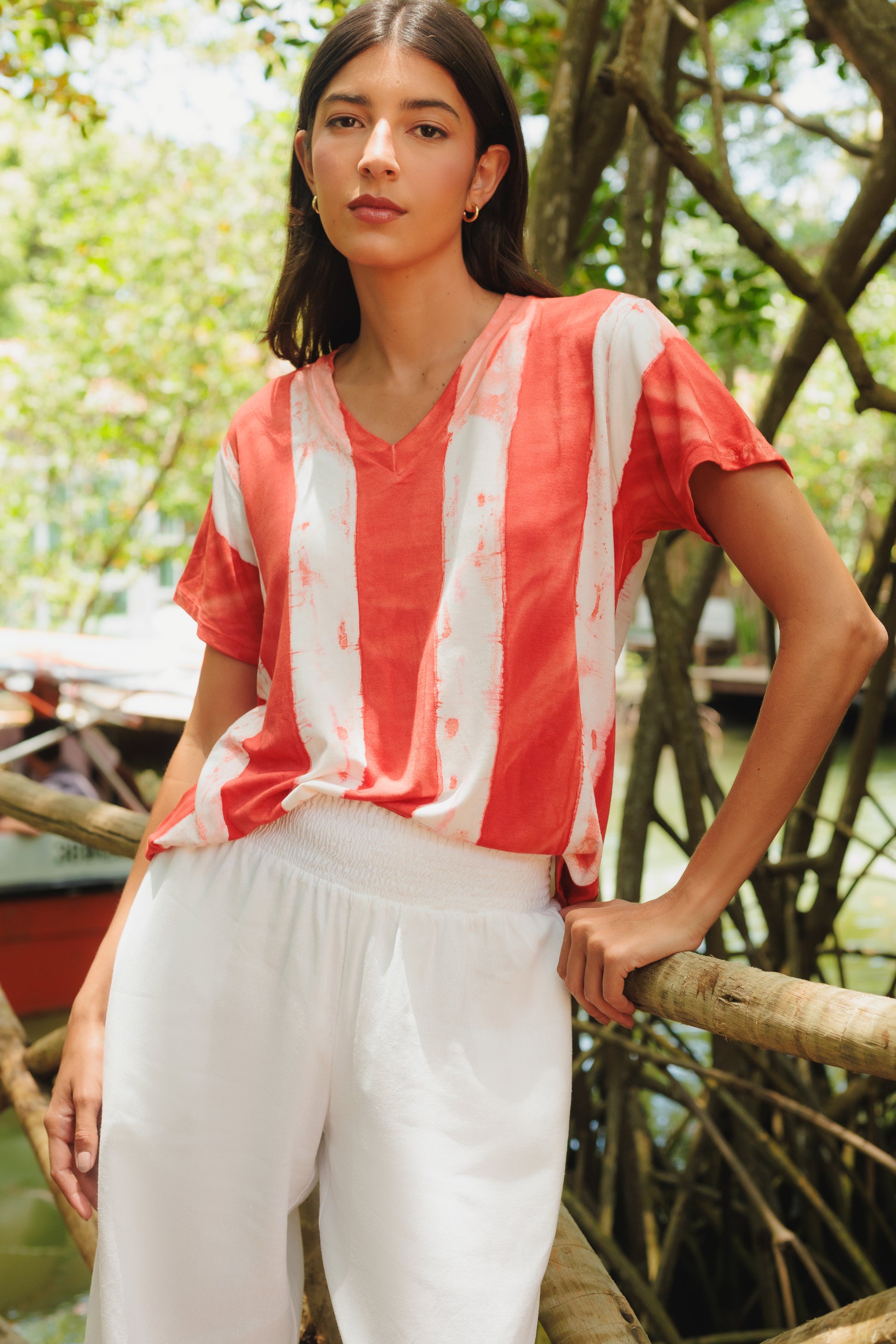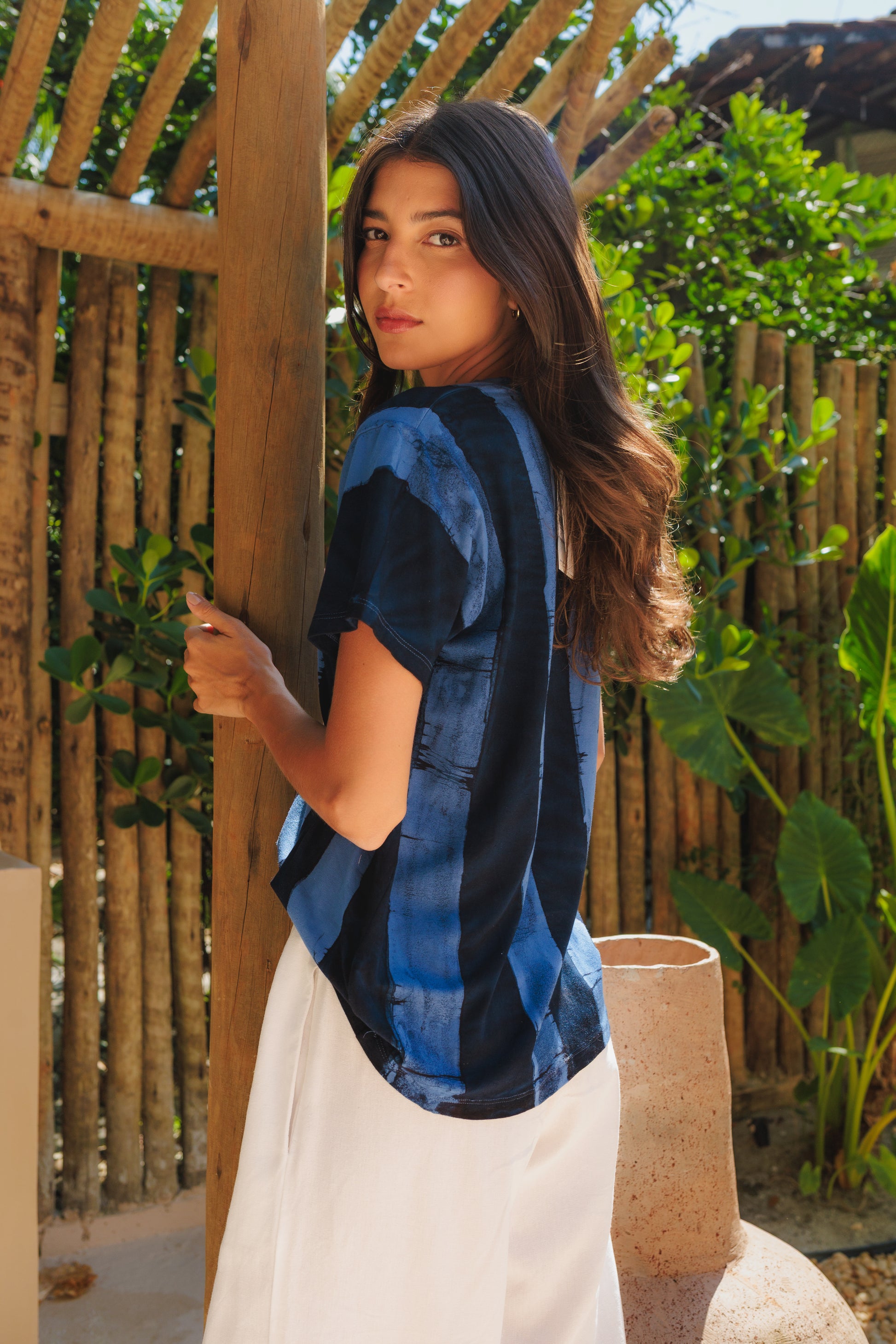 Todas as nossas peças são tingidas manualmente e individualmente, o que possibilita desenvolvermos peças únicas e 100% artesanais, com técnicas Shibori e Tiedye.