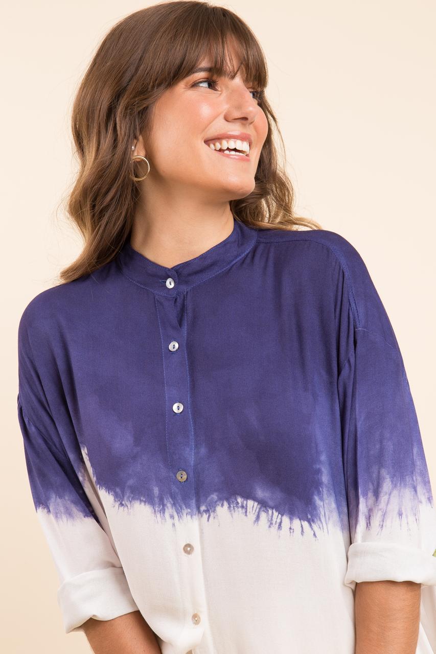 Detalhes: Modelagem ampla e confortável; Abotoamento frontal; Comprimento curto, sendo a parte de trás um pouco mais comprida; Manga longa, com abotoamento no punho.