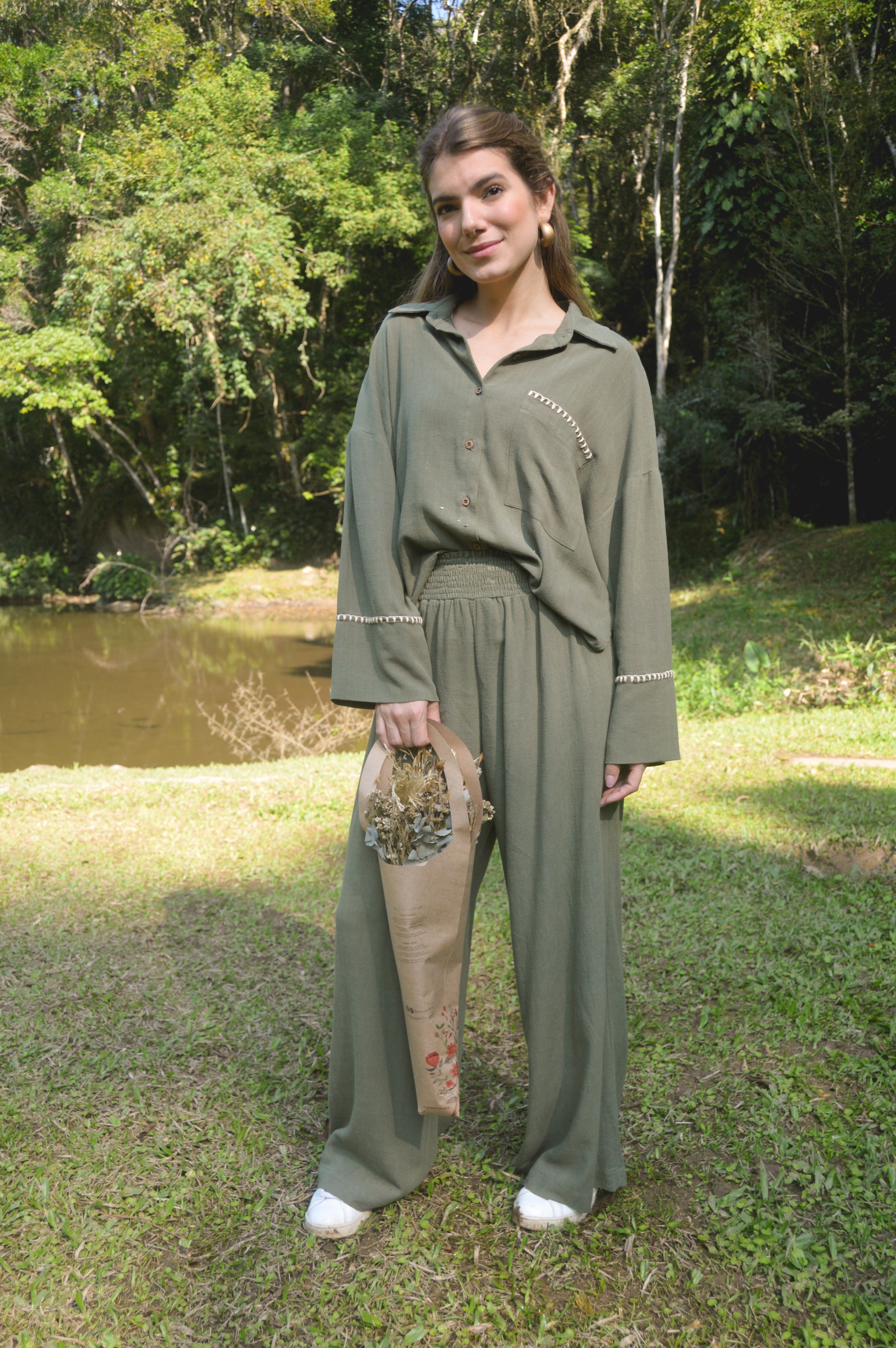 Calça com modelagem soltinha, bolso faca e lastex na cintura, proporcionando conforto e praticidade para vestir.