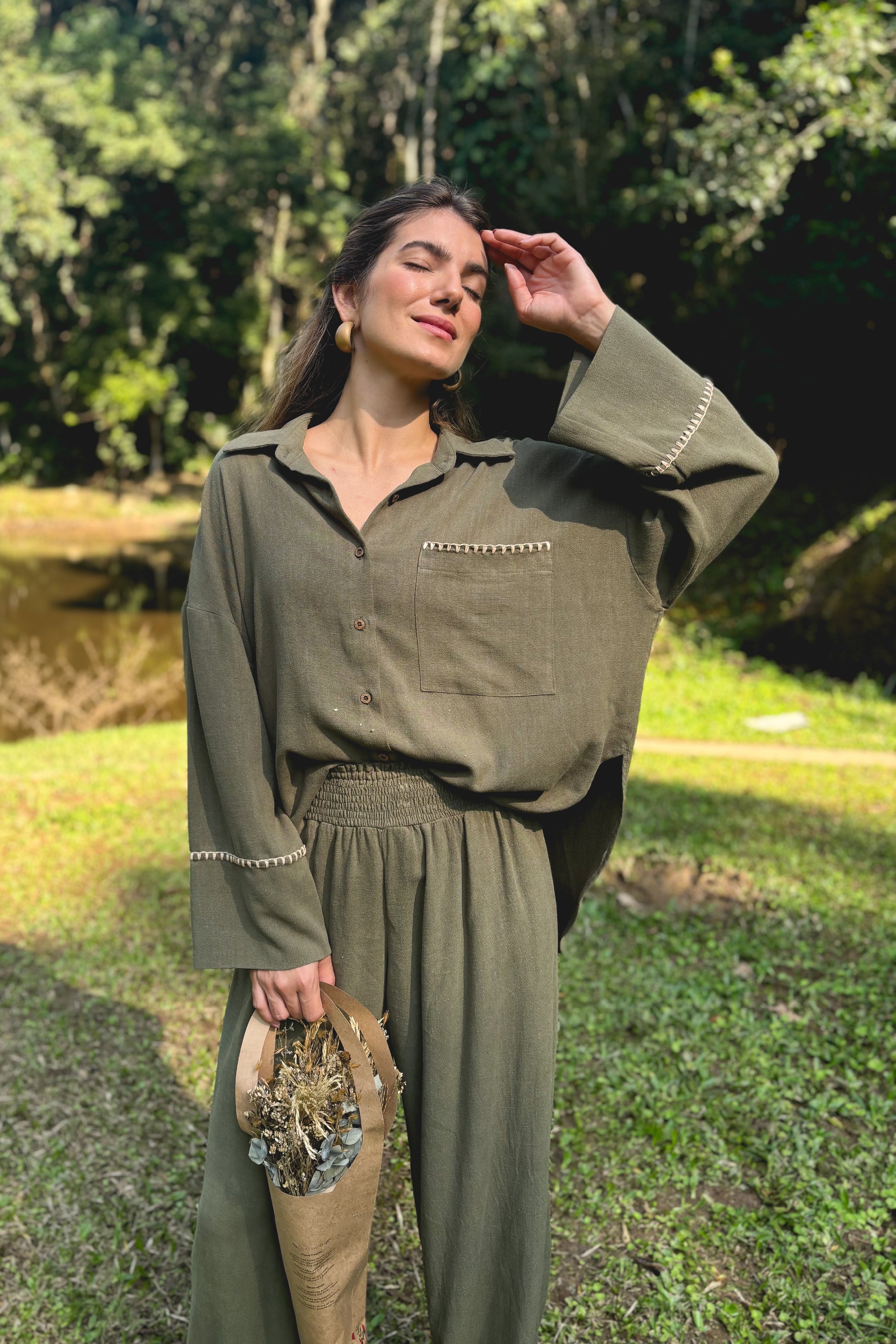 Camisa com modelagem ampla e detalhes bordados à mão no bolso e no punho.