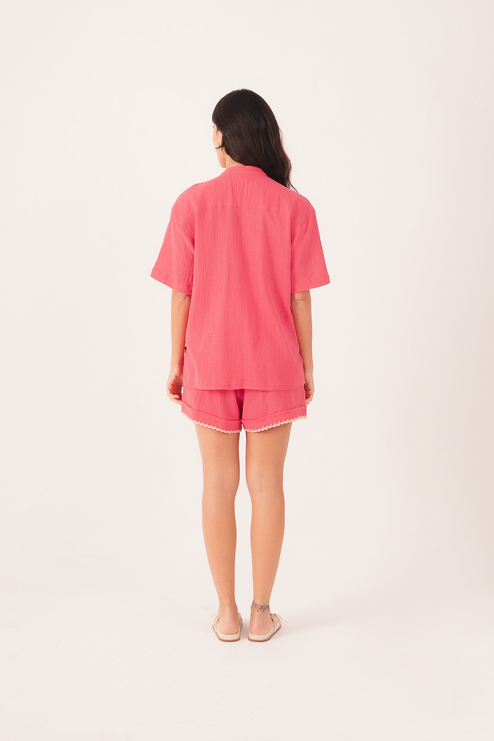 Conjunto confeccionado em 100% algodão, super fresco e com um tom de rosa lindo que alegra qualquer dia. Os bordados de crochê se destacam no bolso da camisa e nos detalhes do short e trazem aquele toque artesanal que faz toda a diferença!