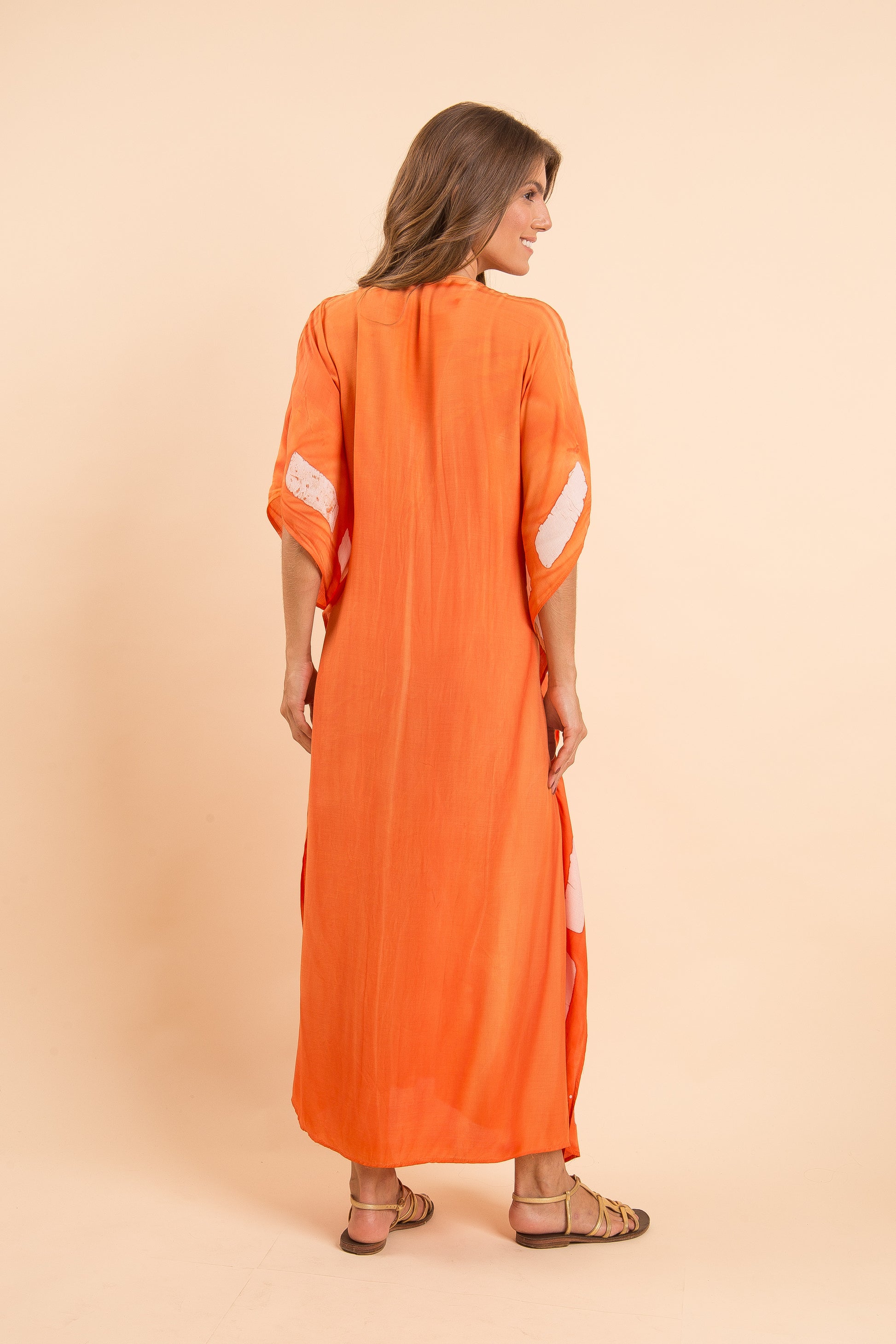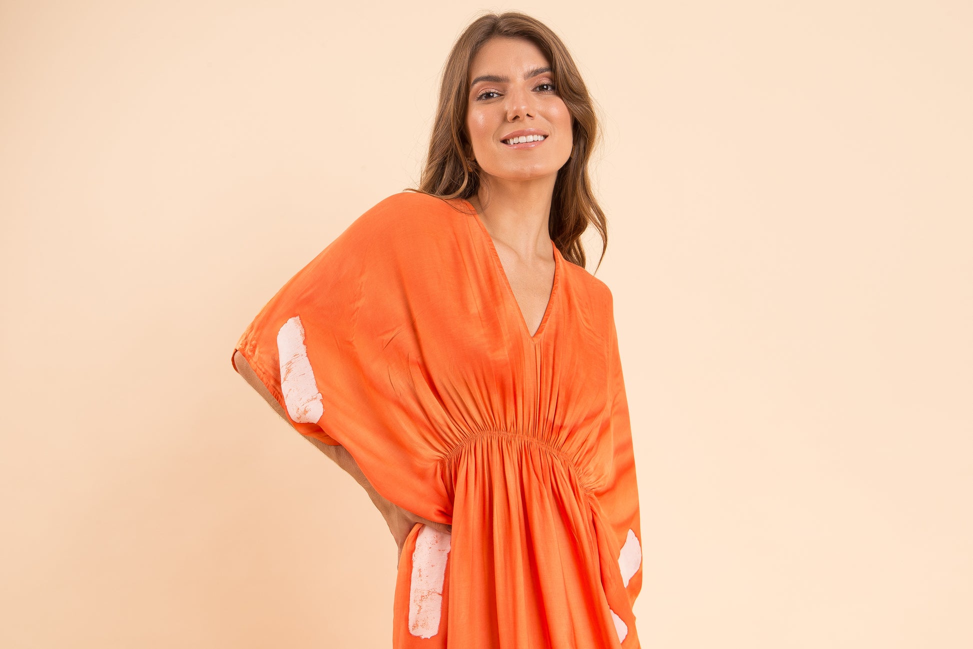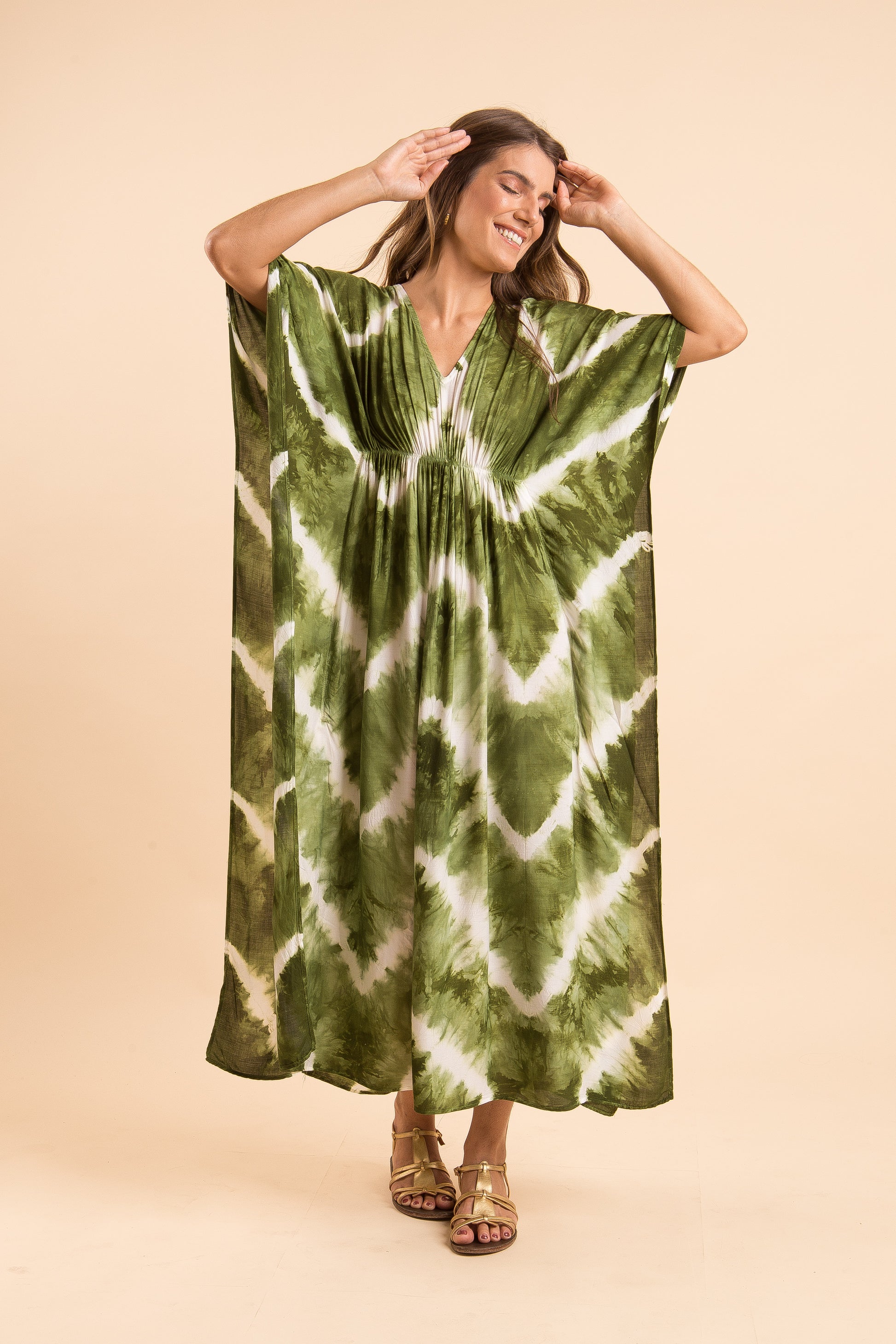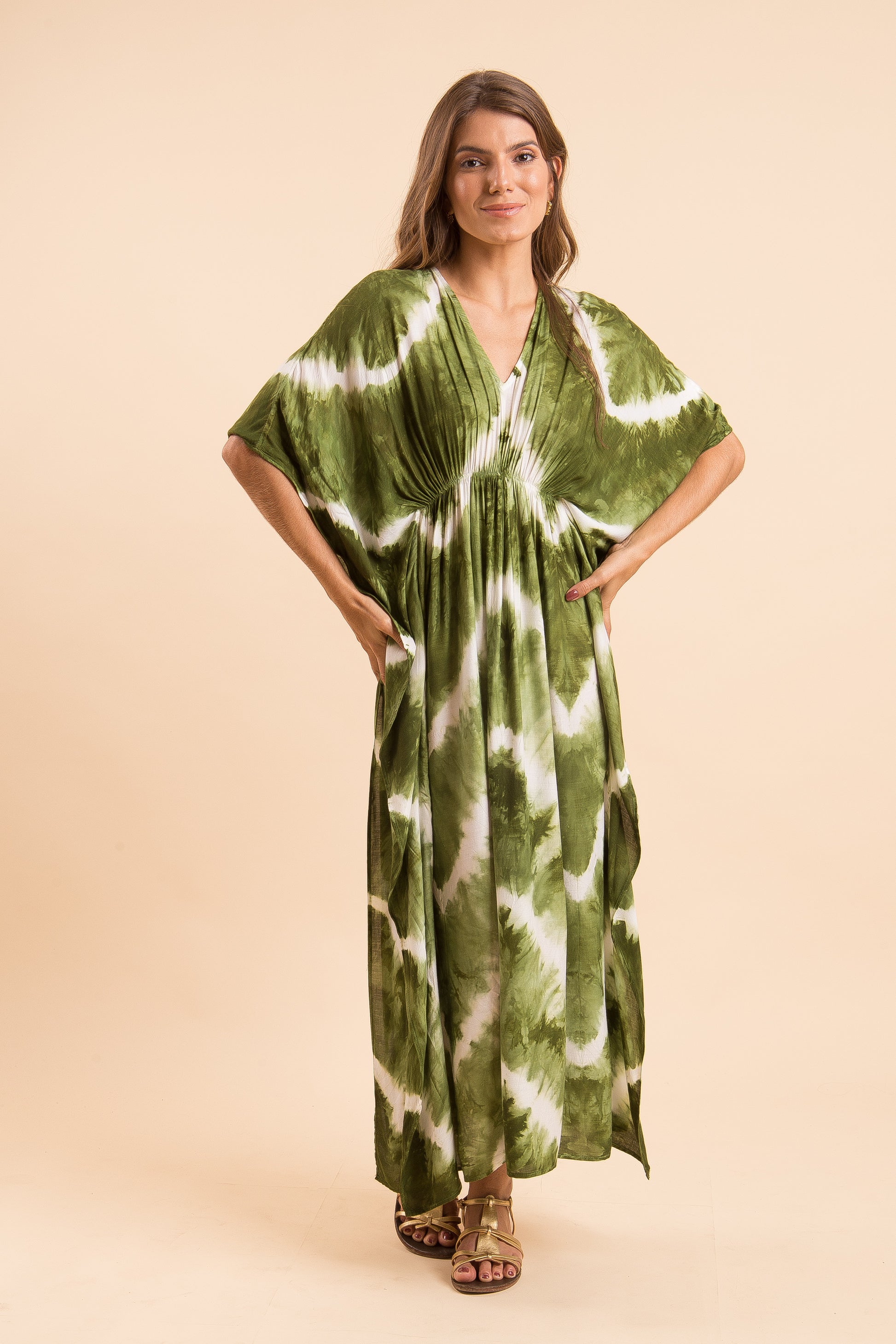 Kaftan longo com modelagem ampla, decote V, elástico na cintura, cheio de movimento e bossa.