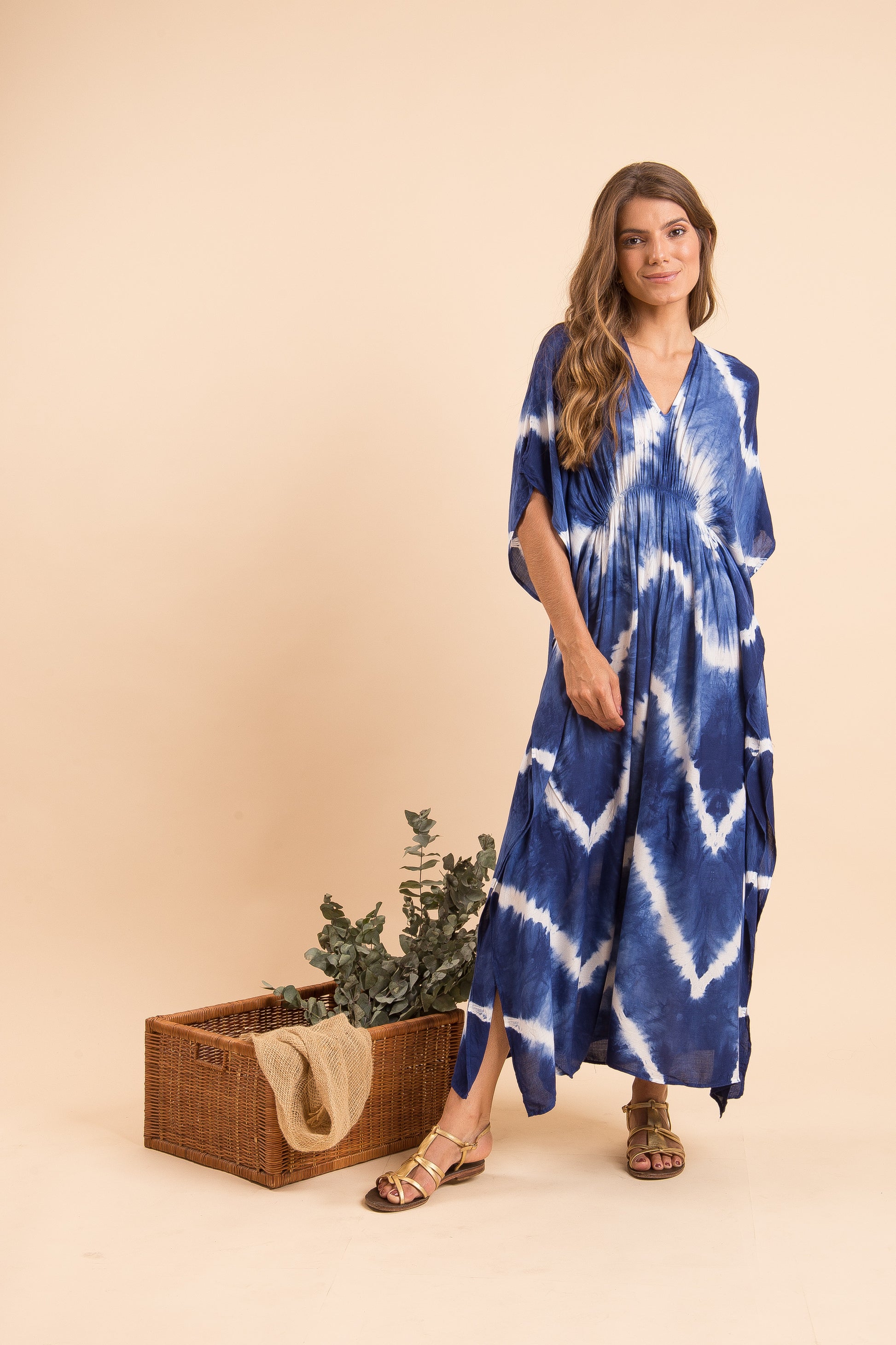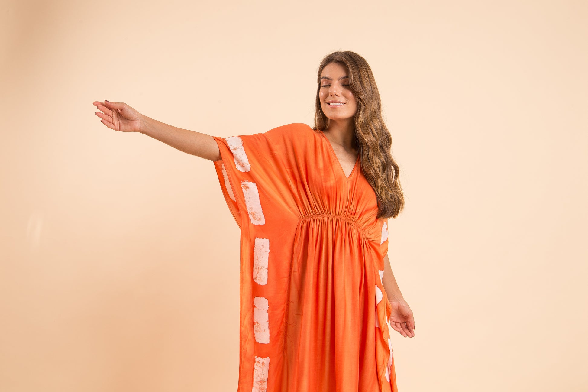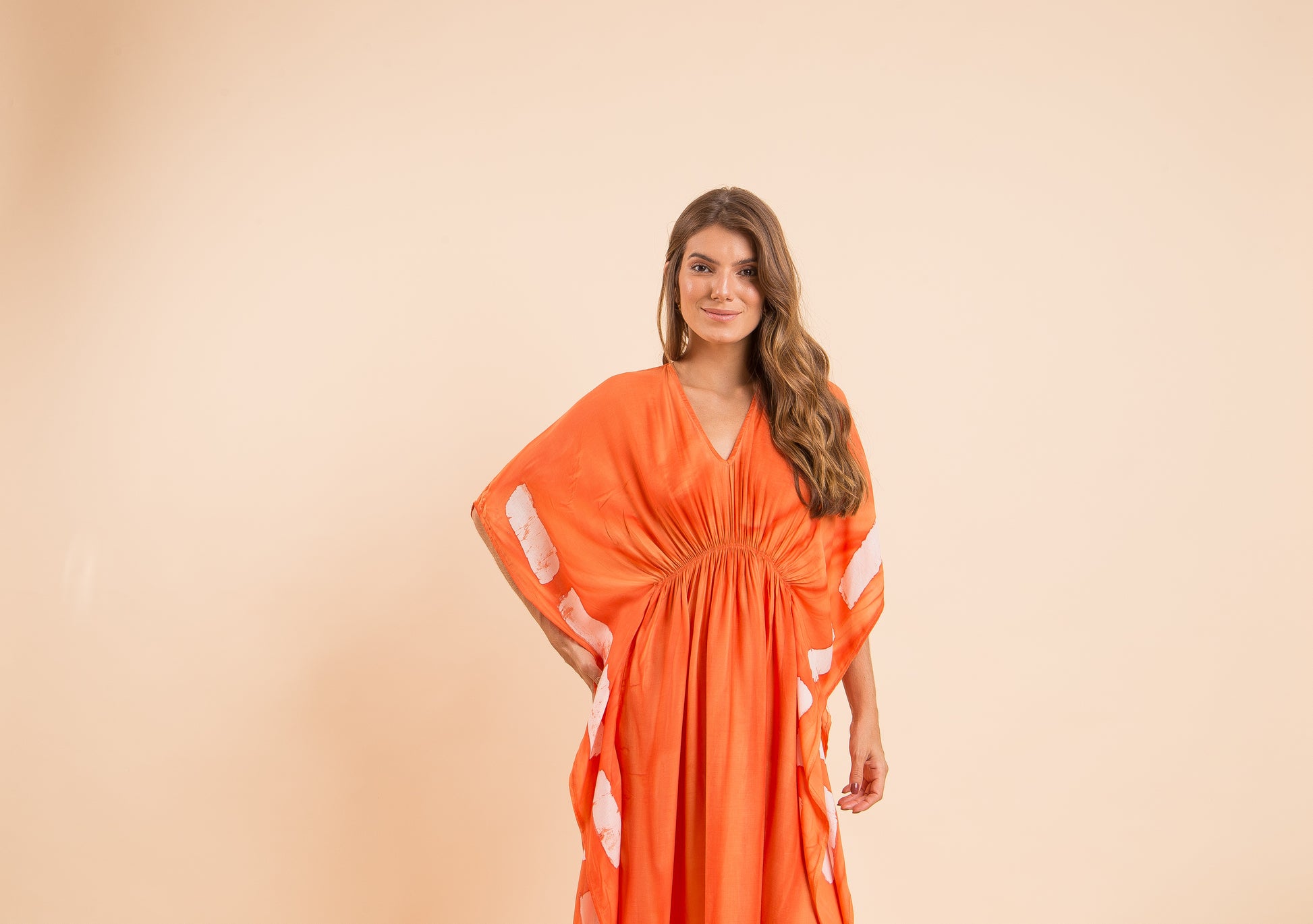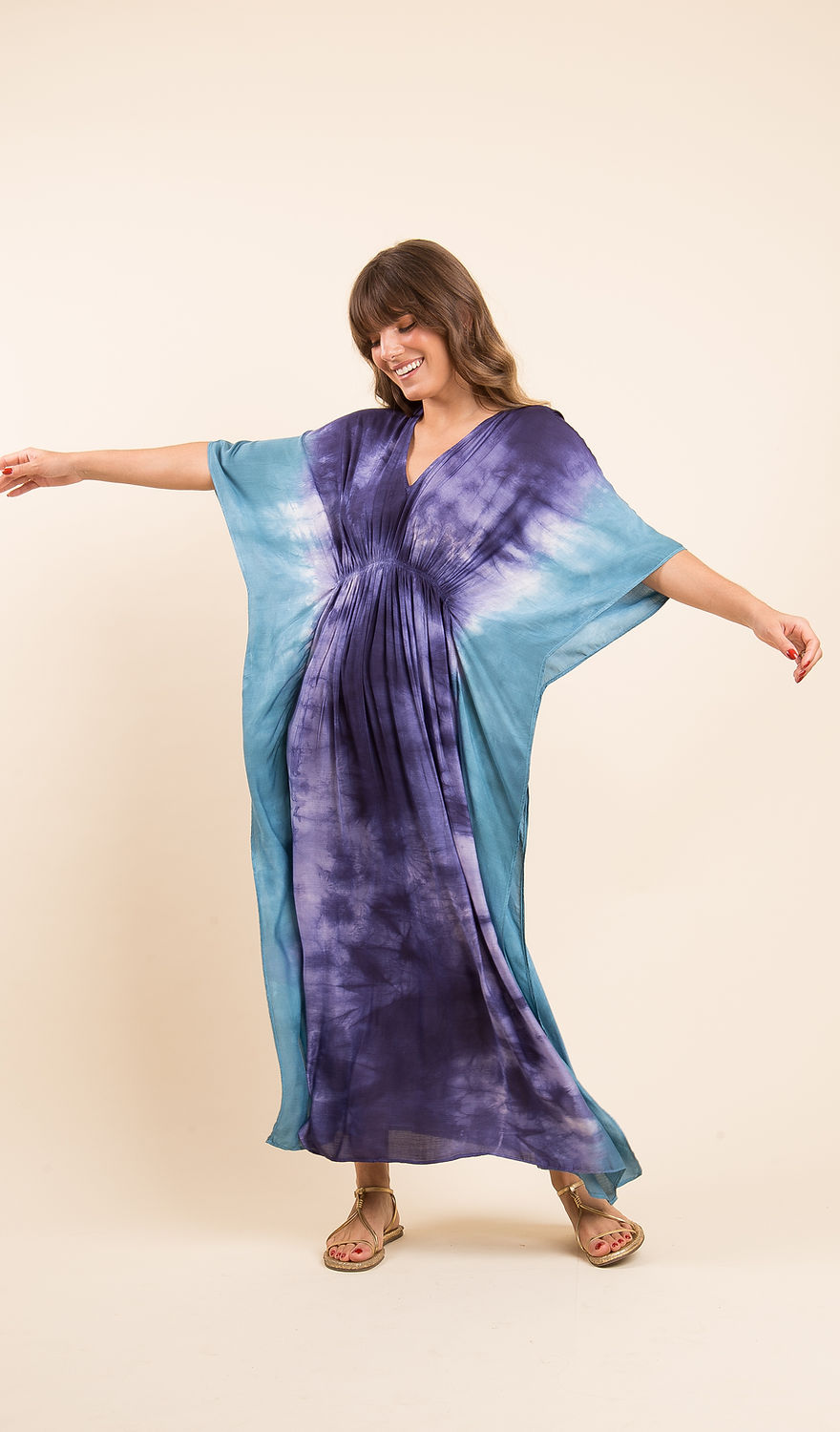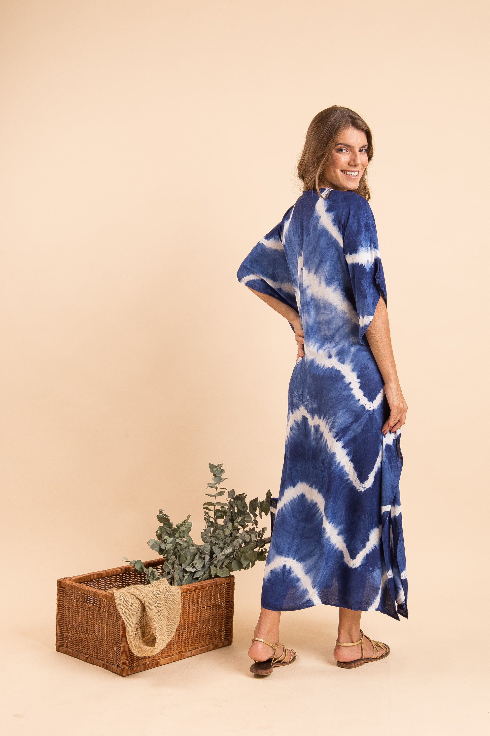 Kaftan longo com modelagem ampla, decote V, elástico na cintura, cheio de movimento e bossa.