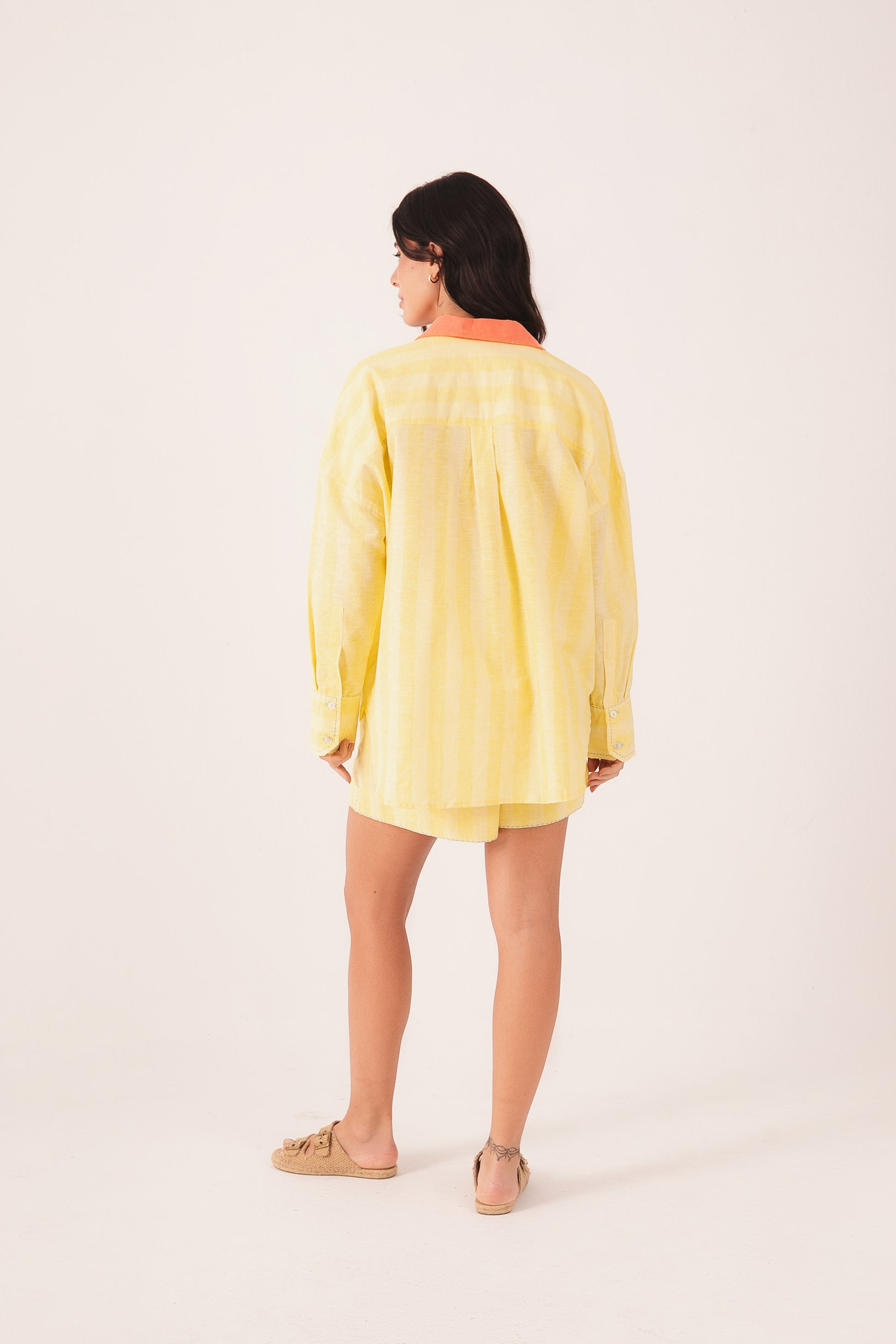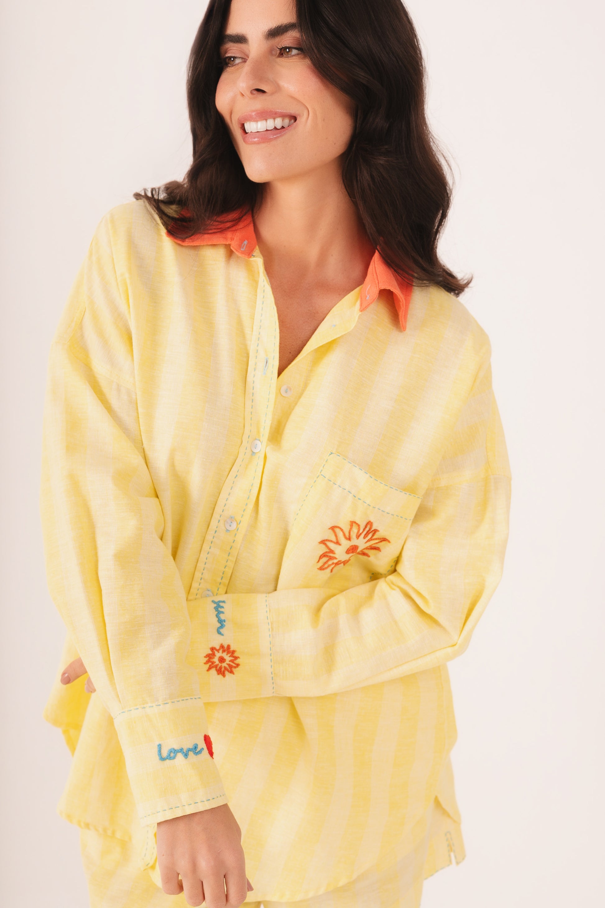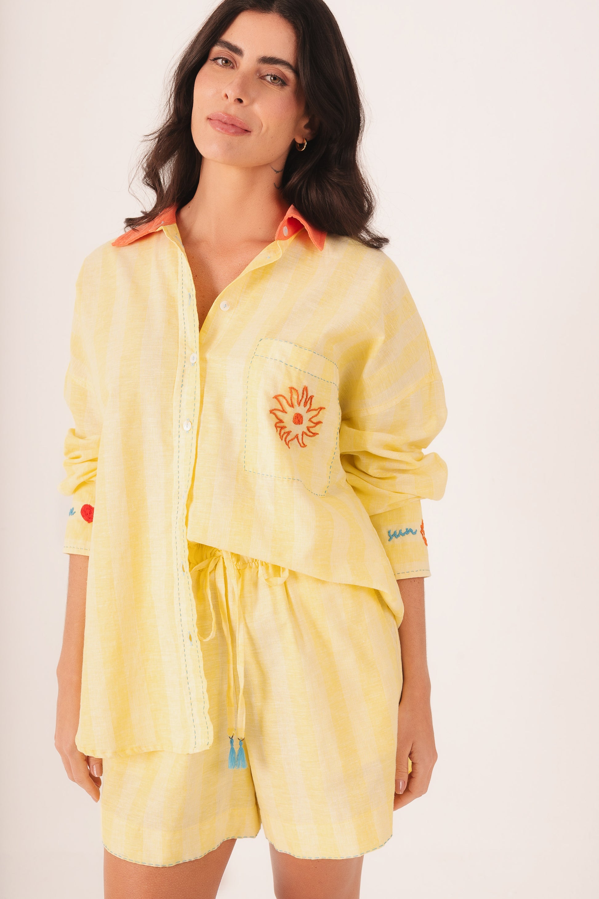 Conjunto confeccionado em linho com viscose, com discretas listras amarelas, gola coral e bordados à mão que trazem a essência ainda mais solar para esse conjunto, que é o queridinho da coleção.