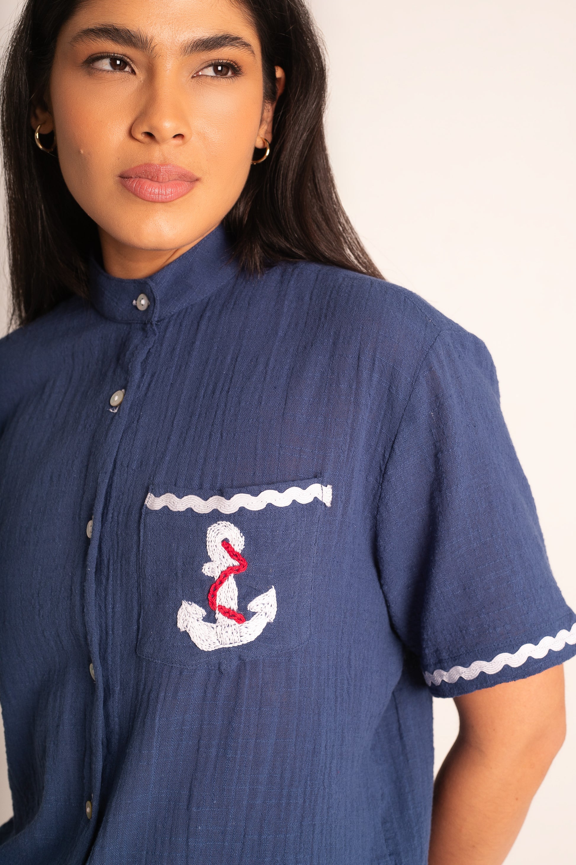 Conjuntinho confeccionado em tecido 100% algodão, modelagem soltinha, com bordado à mão de âncora no bolso e detalhes ccontrastando sianinha, puro charme!