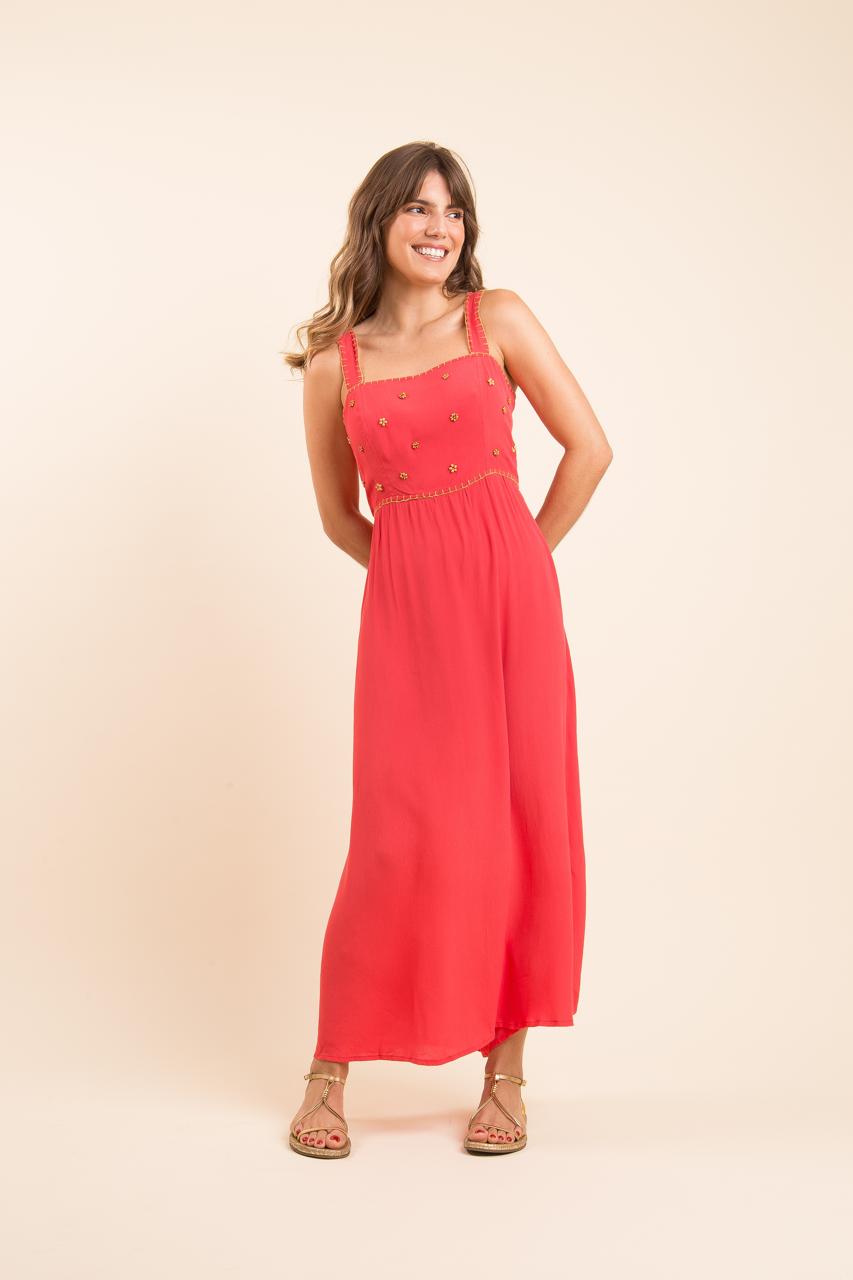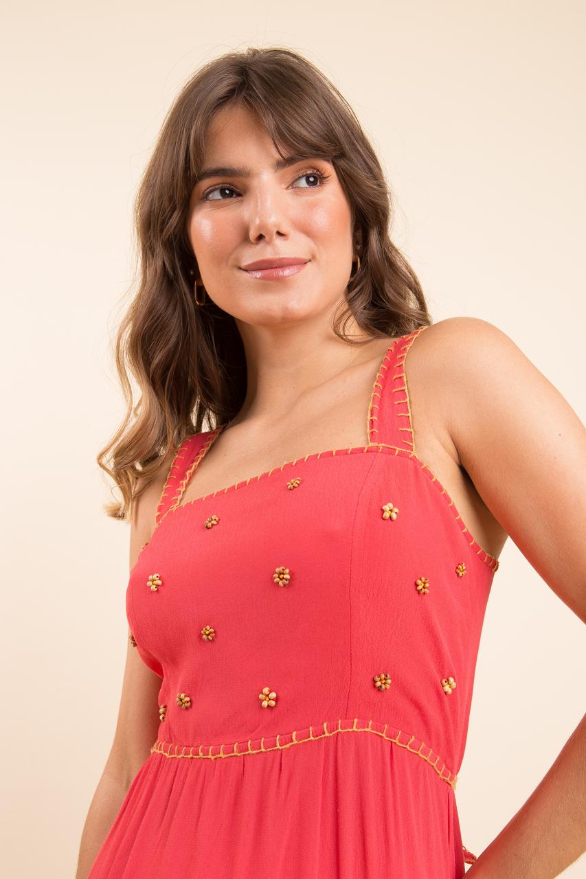 Vestido delicado, valoriza o busto com bordado com missangas de madeira formando florzinhas.
