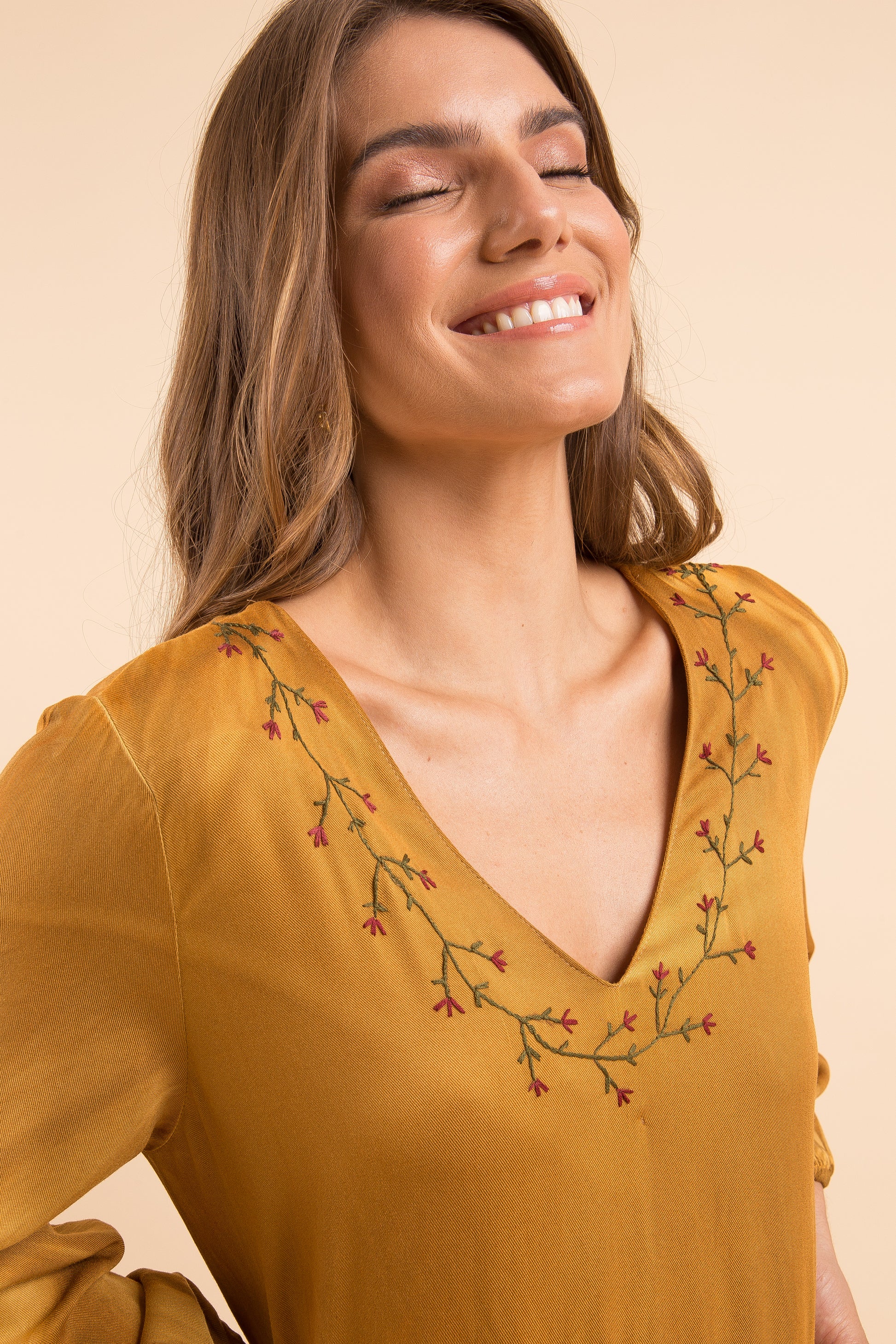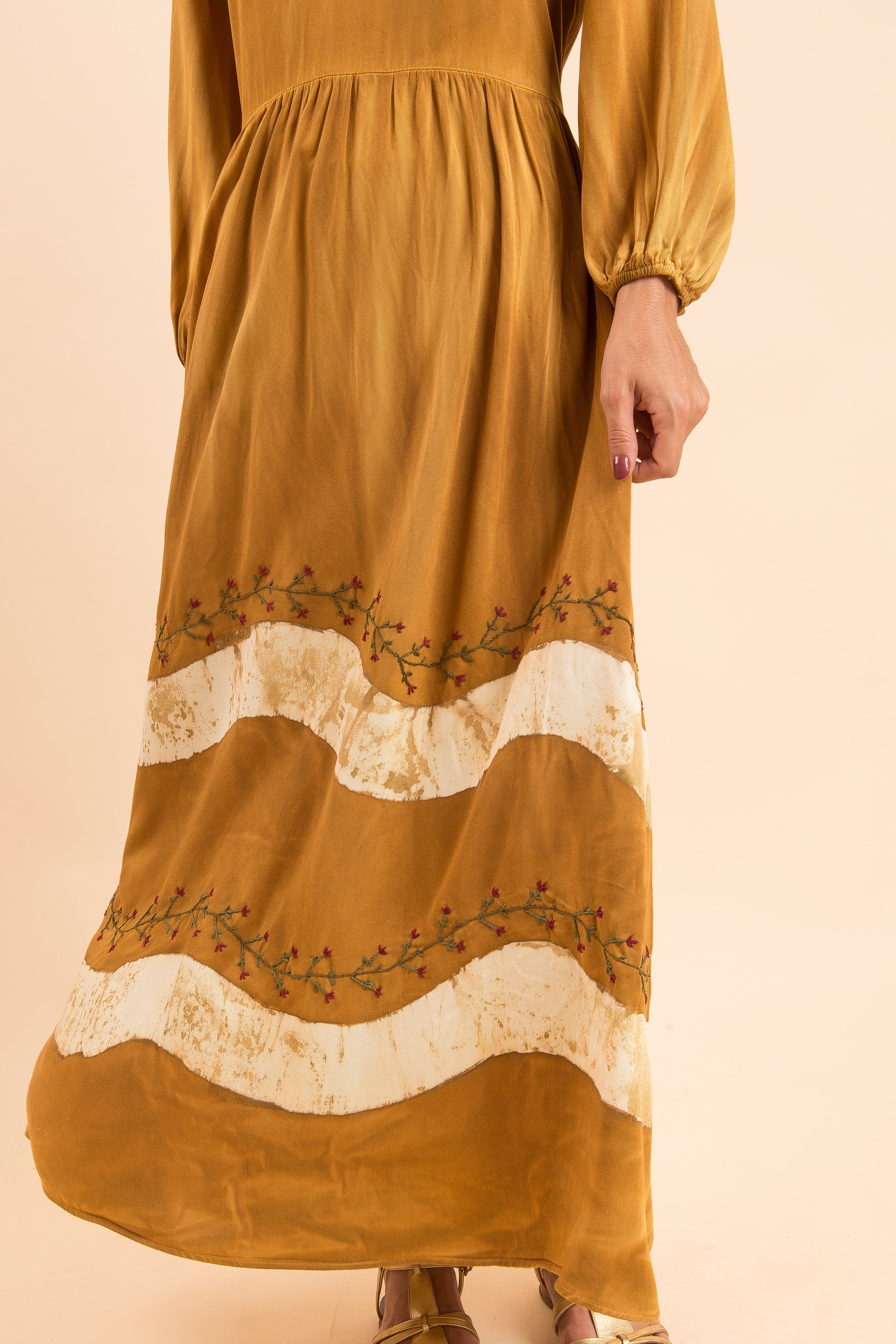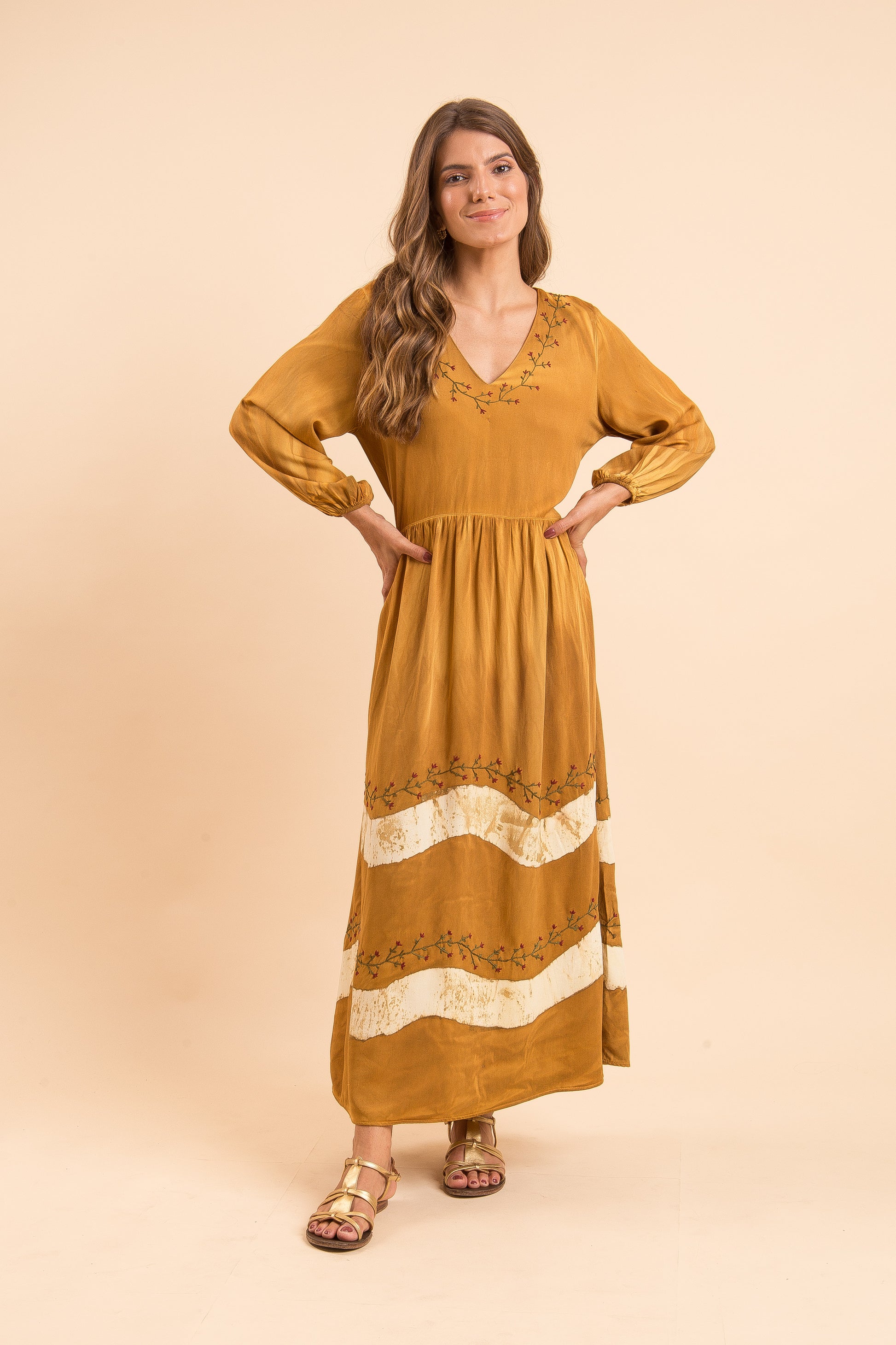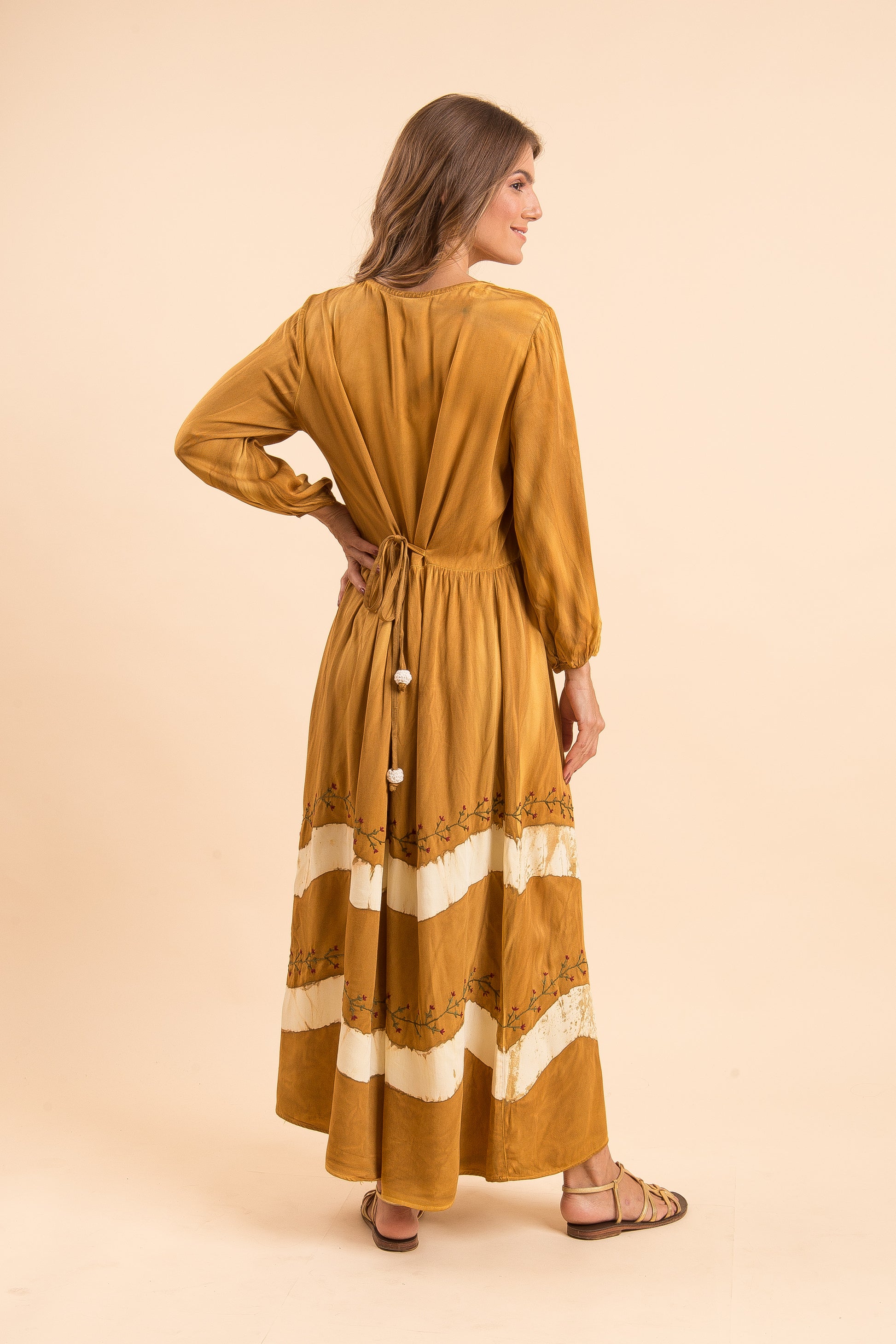 Nesse vestido juntamos tudo que mais amamos - o tingimento e o bordado. Vestido 100% artesanal, em tons de caramelo, cheio de detalhes, romântico e delicado, com amarração nas costas.