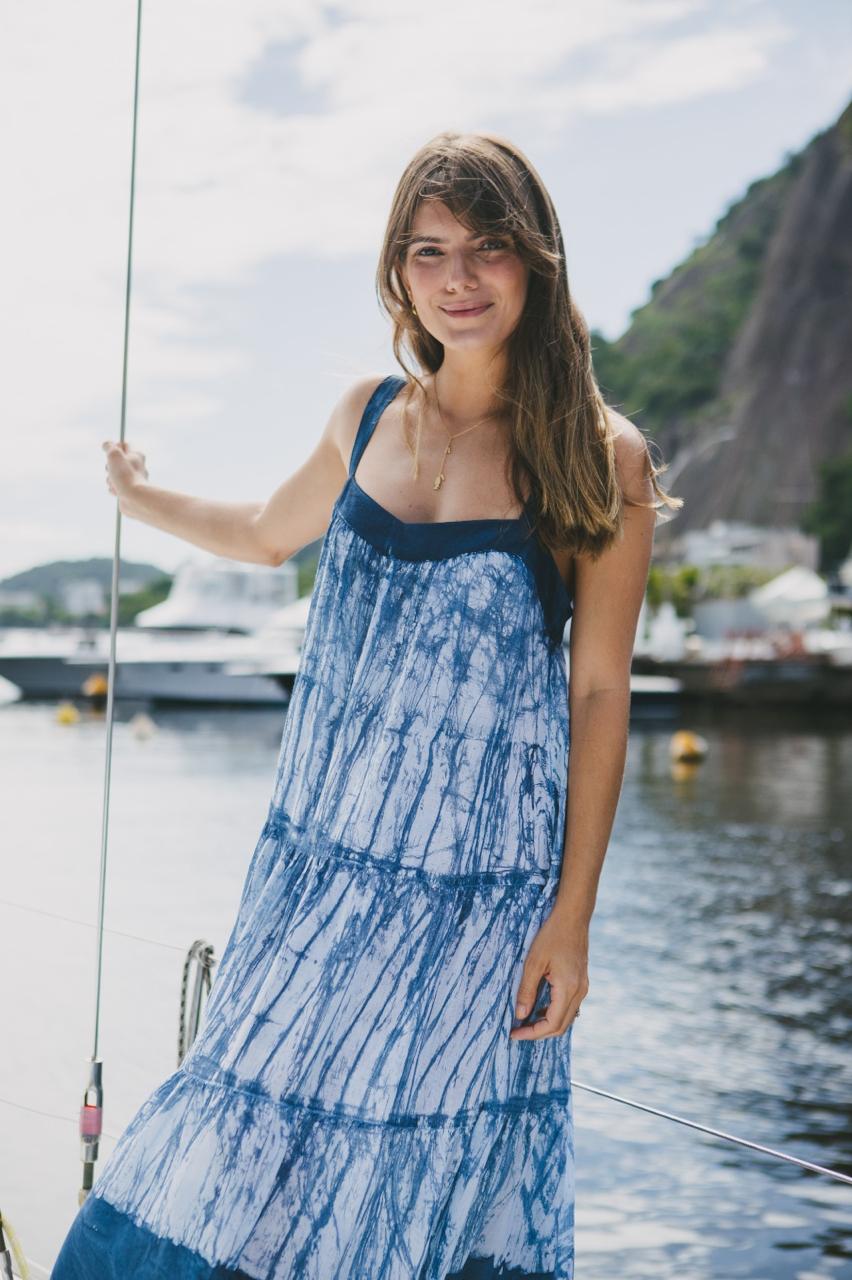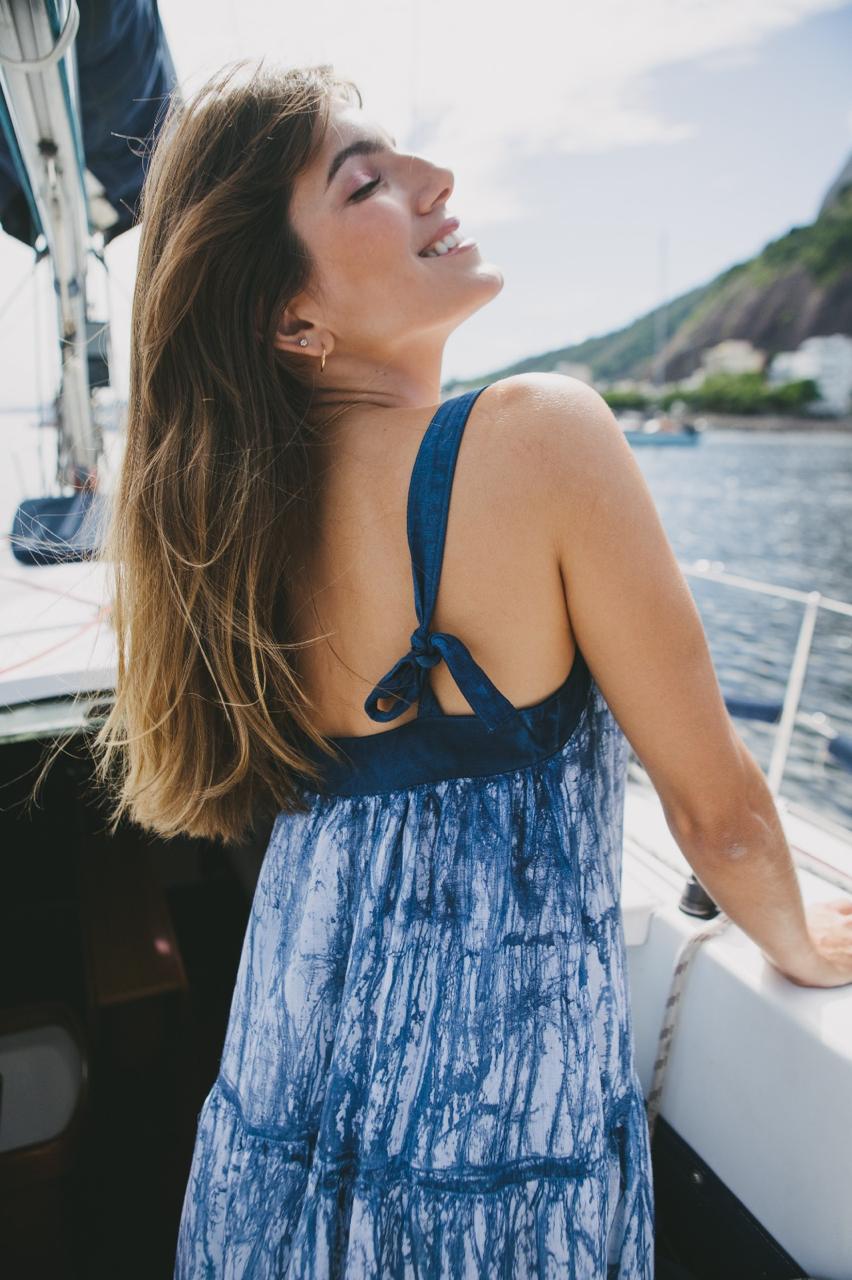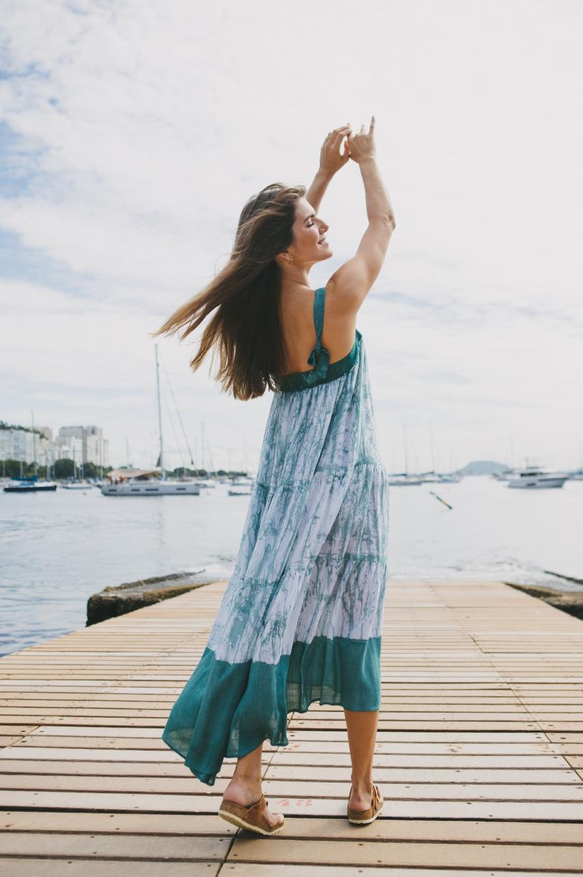 Vestido com modelagem ampla, fluido, um pouco mais comprido atrás, o que deixa o caimento lindo. Alças reguláveis com amarração.