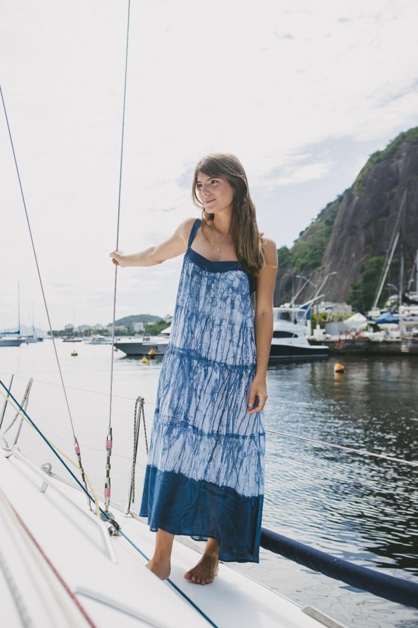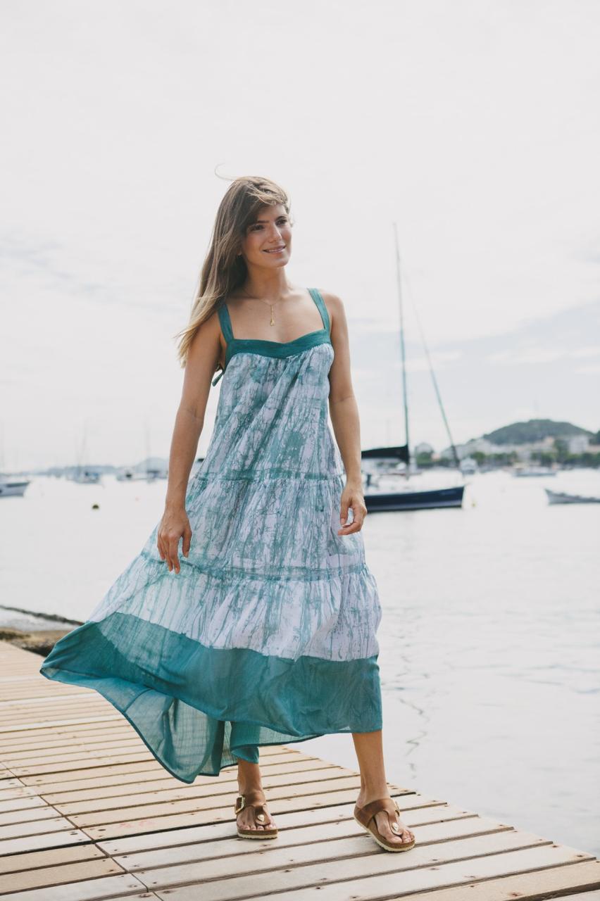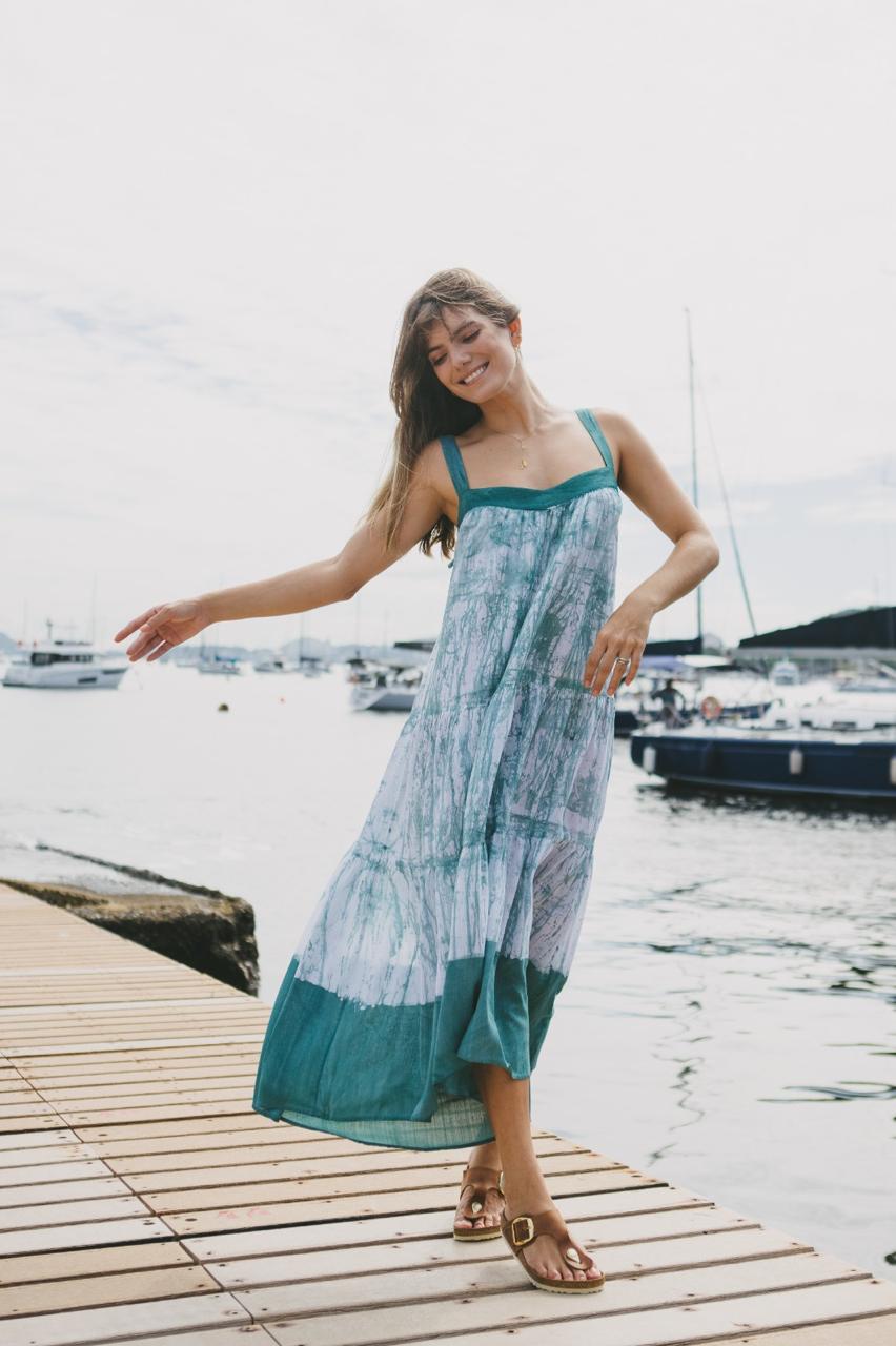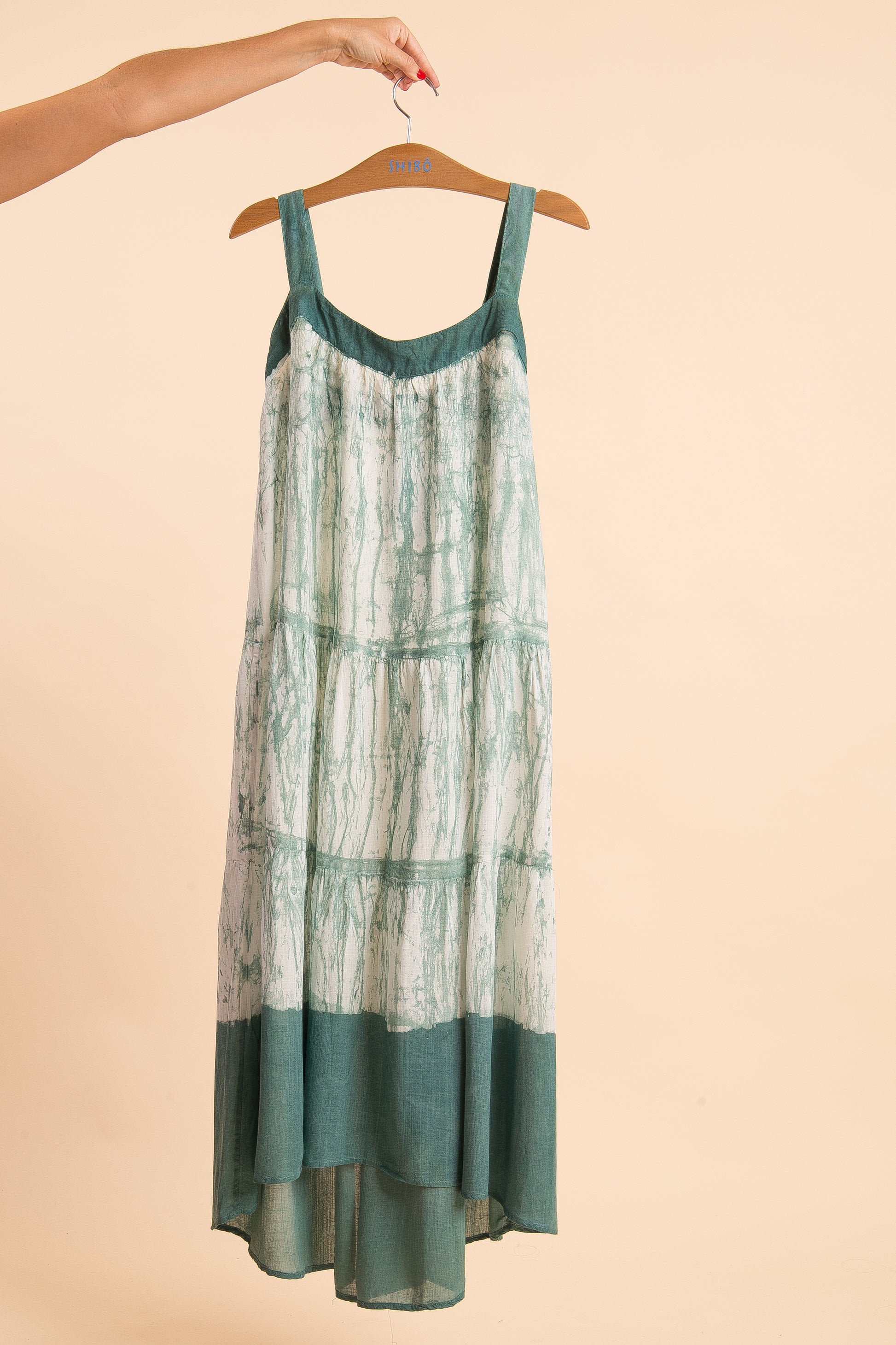 Vestido com modelagem ampla, fluido, um pouco mais comprido atrás, o que deixa o caimento lindo. Alças reguláveis com amarração.