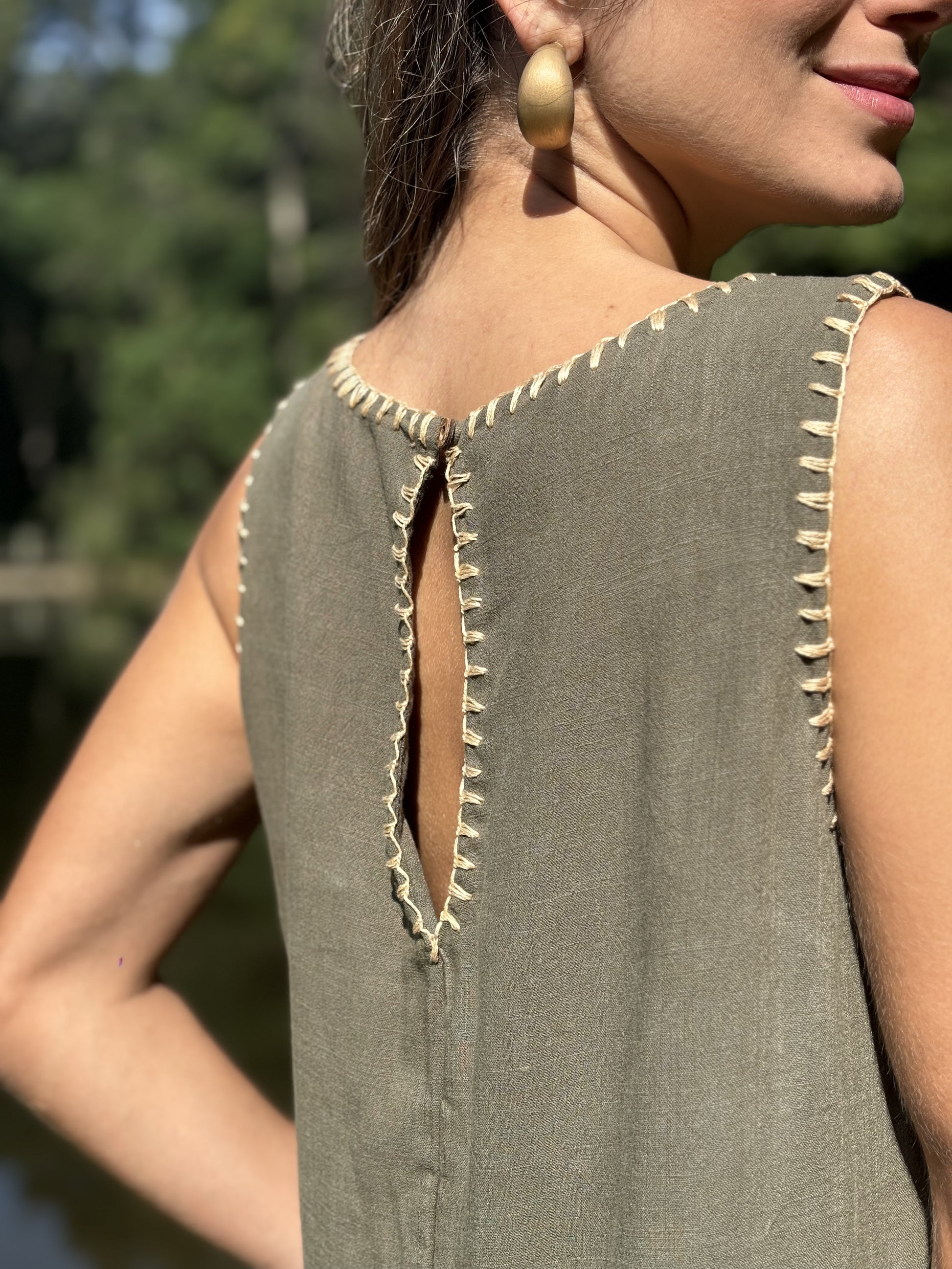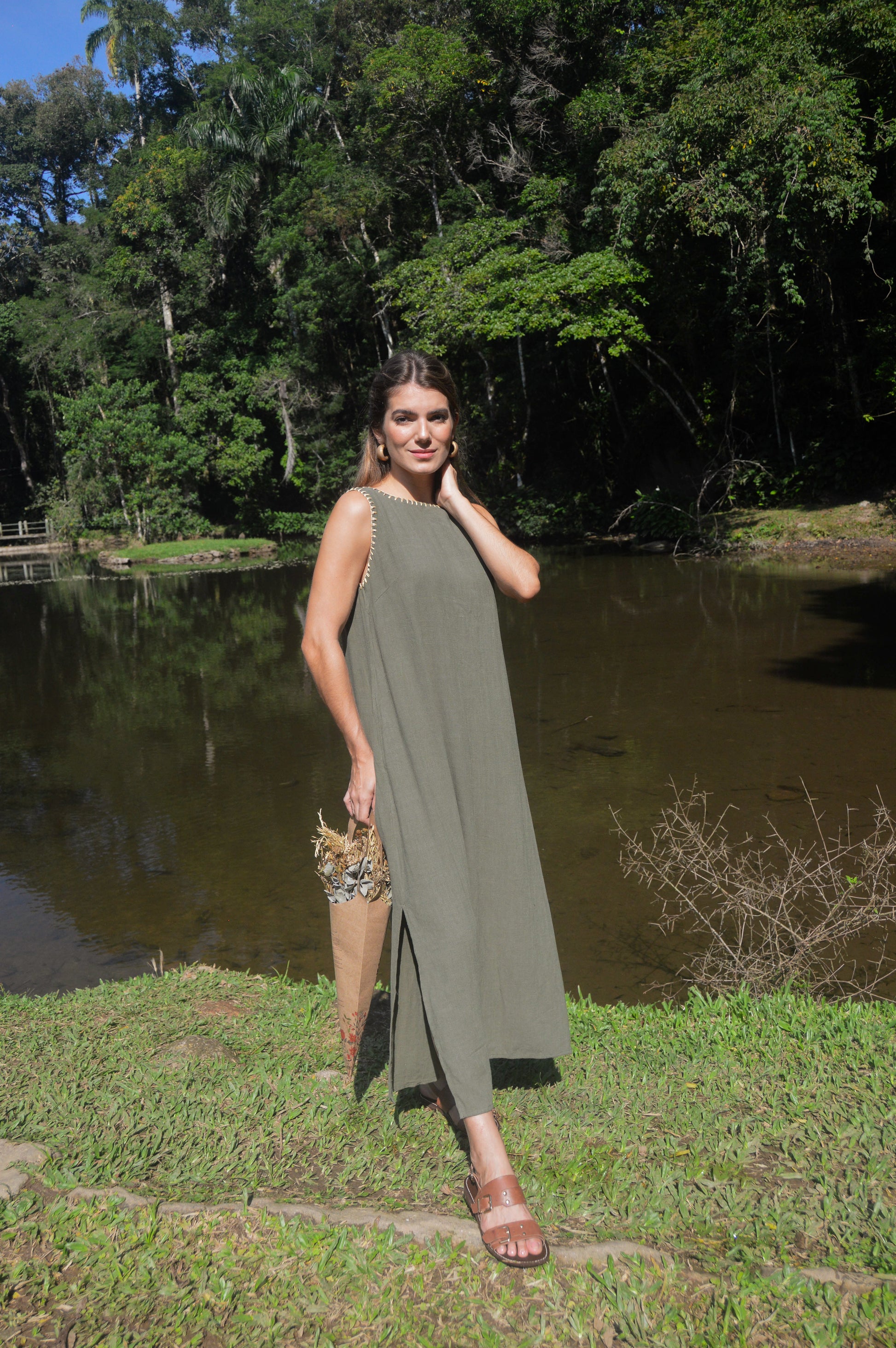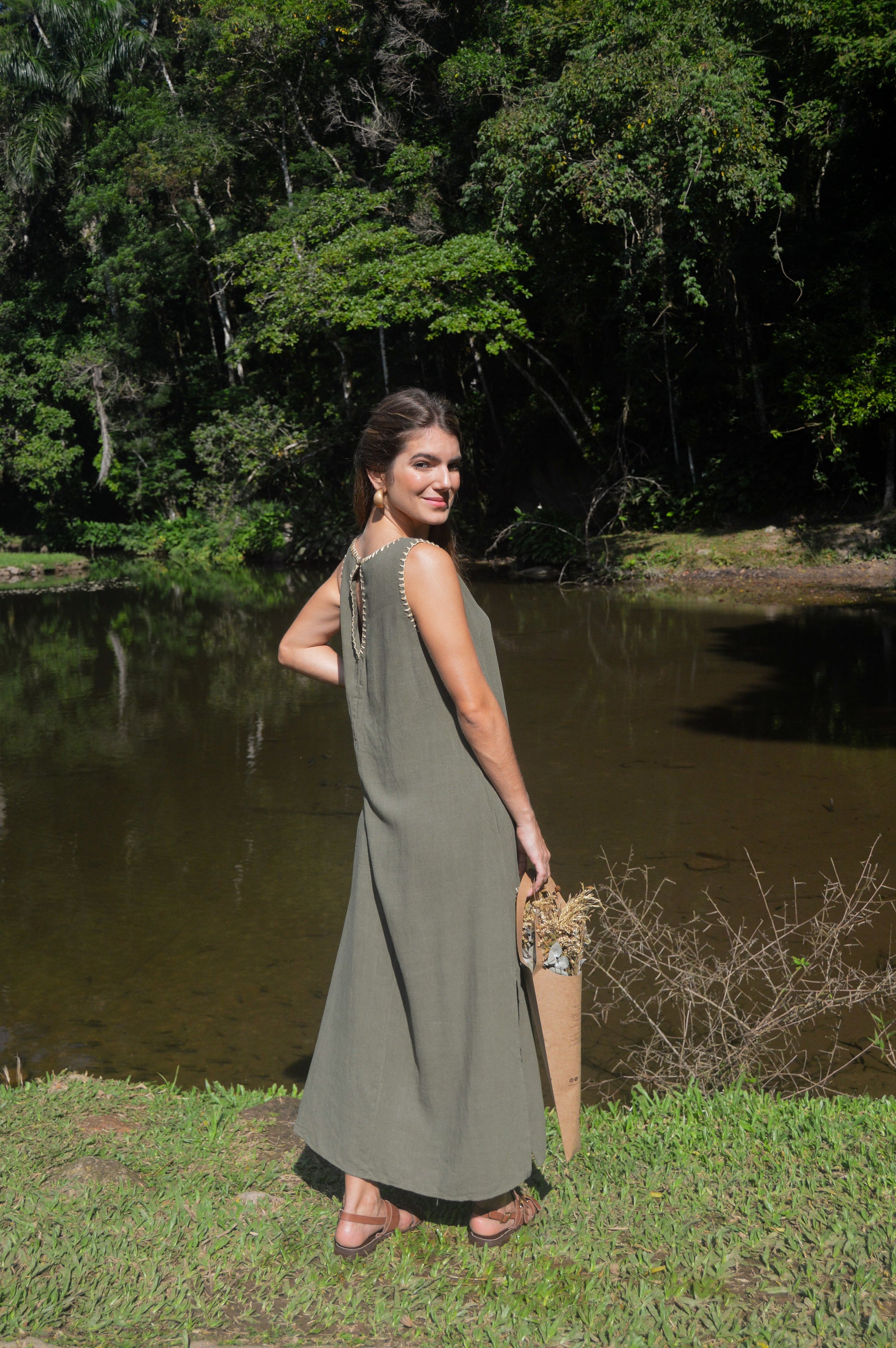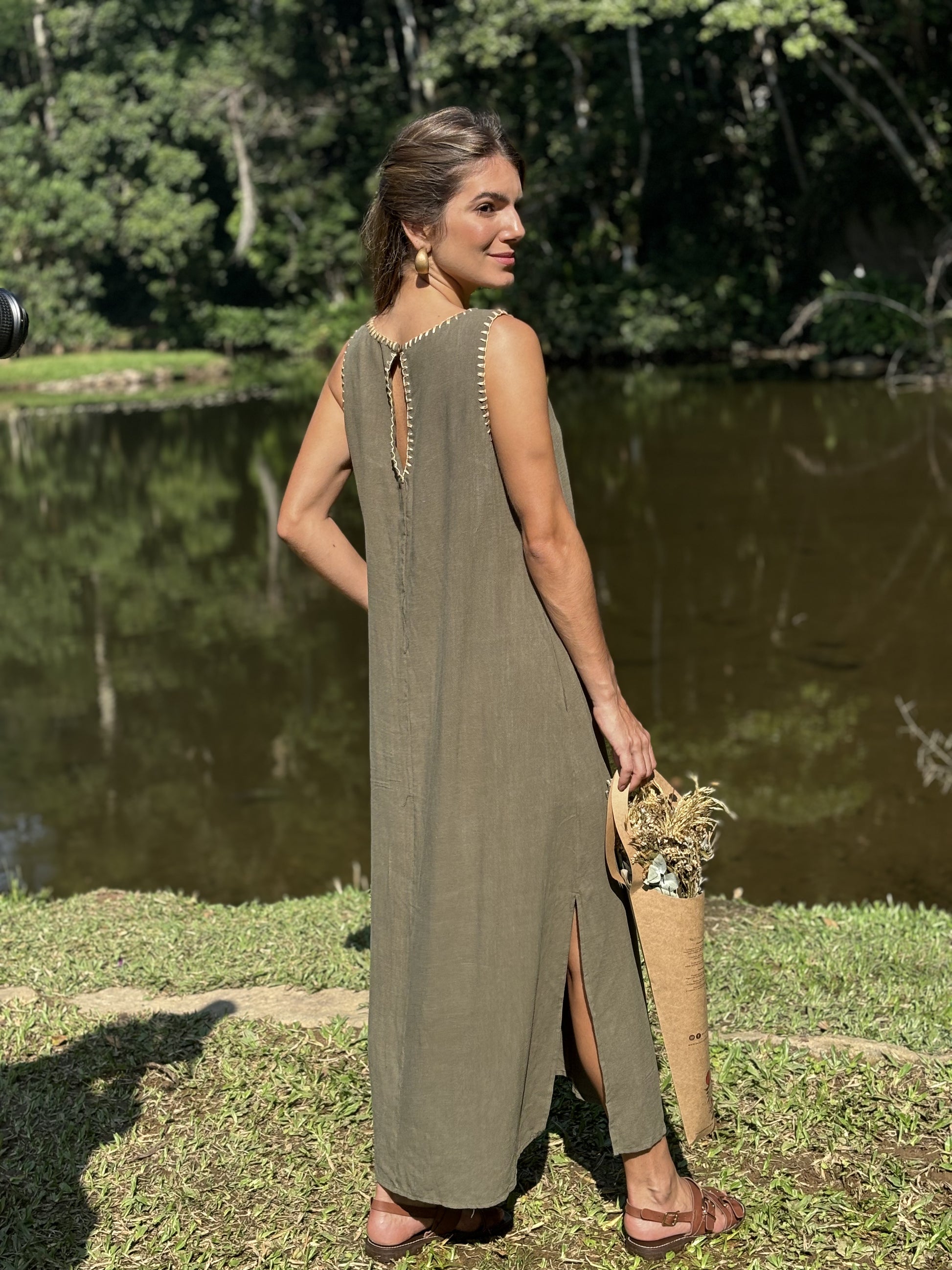 Vestido de linho com viscose, com modelagem reta, decote em gota nas costas, bolsos e detalhes bordados à mão.