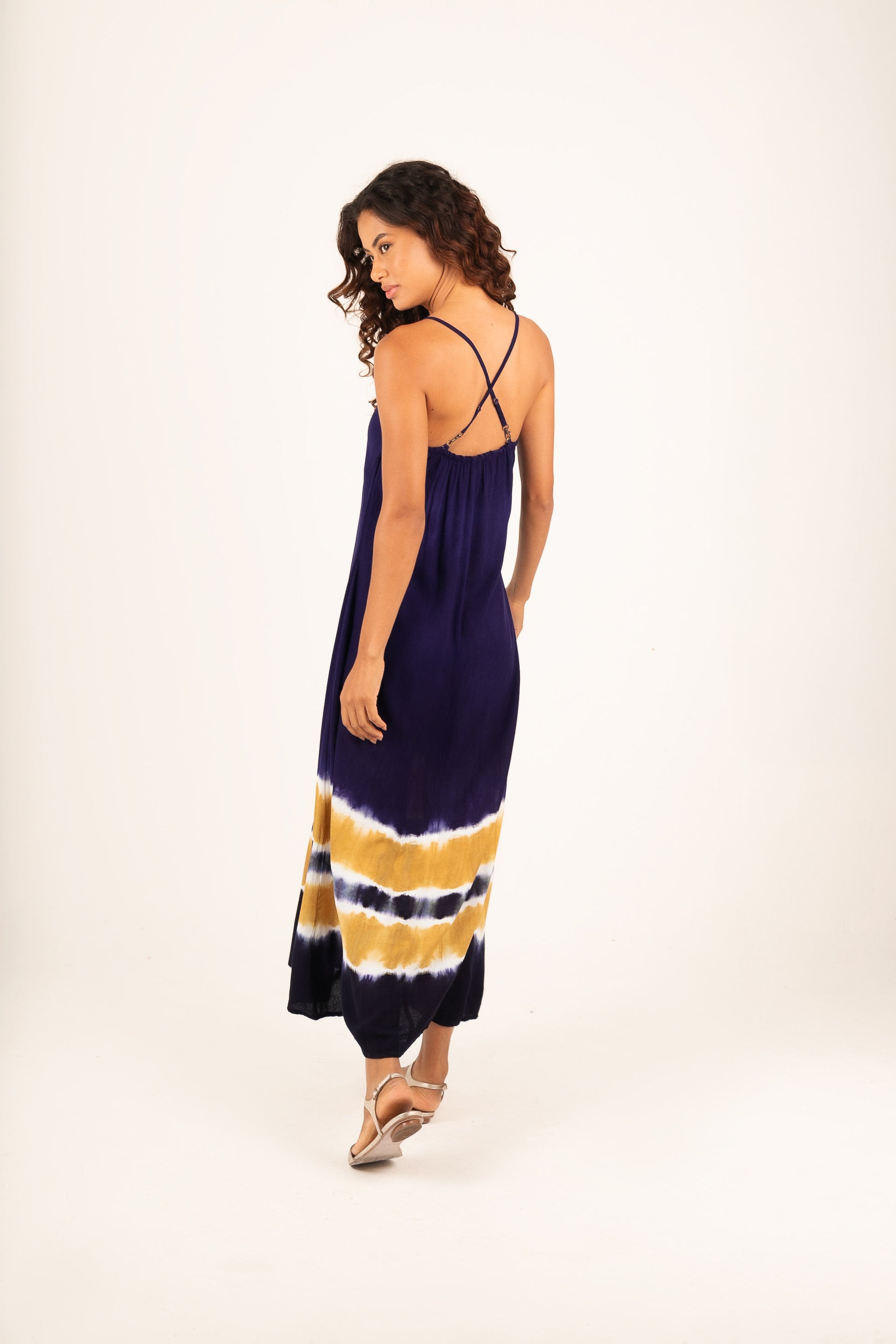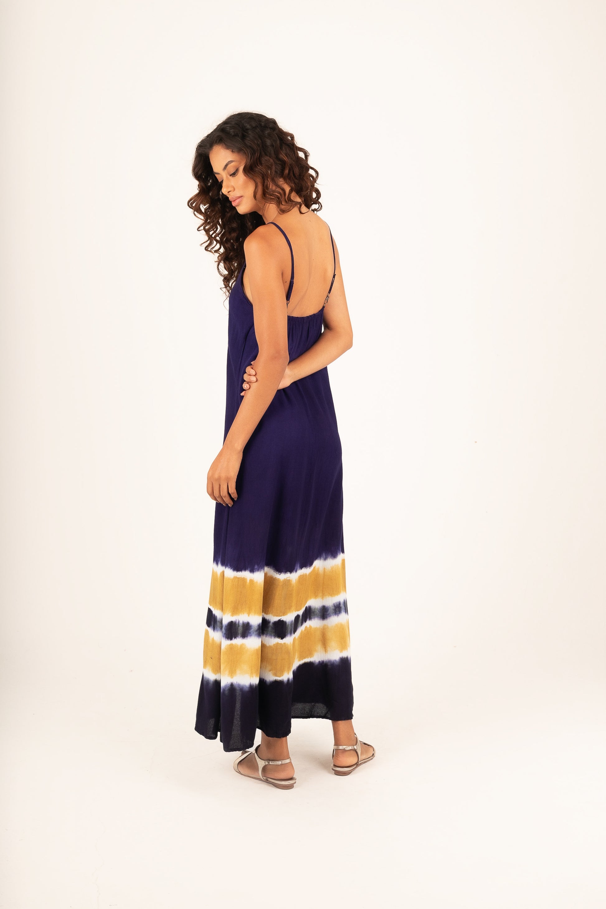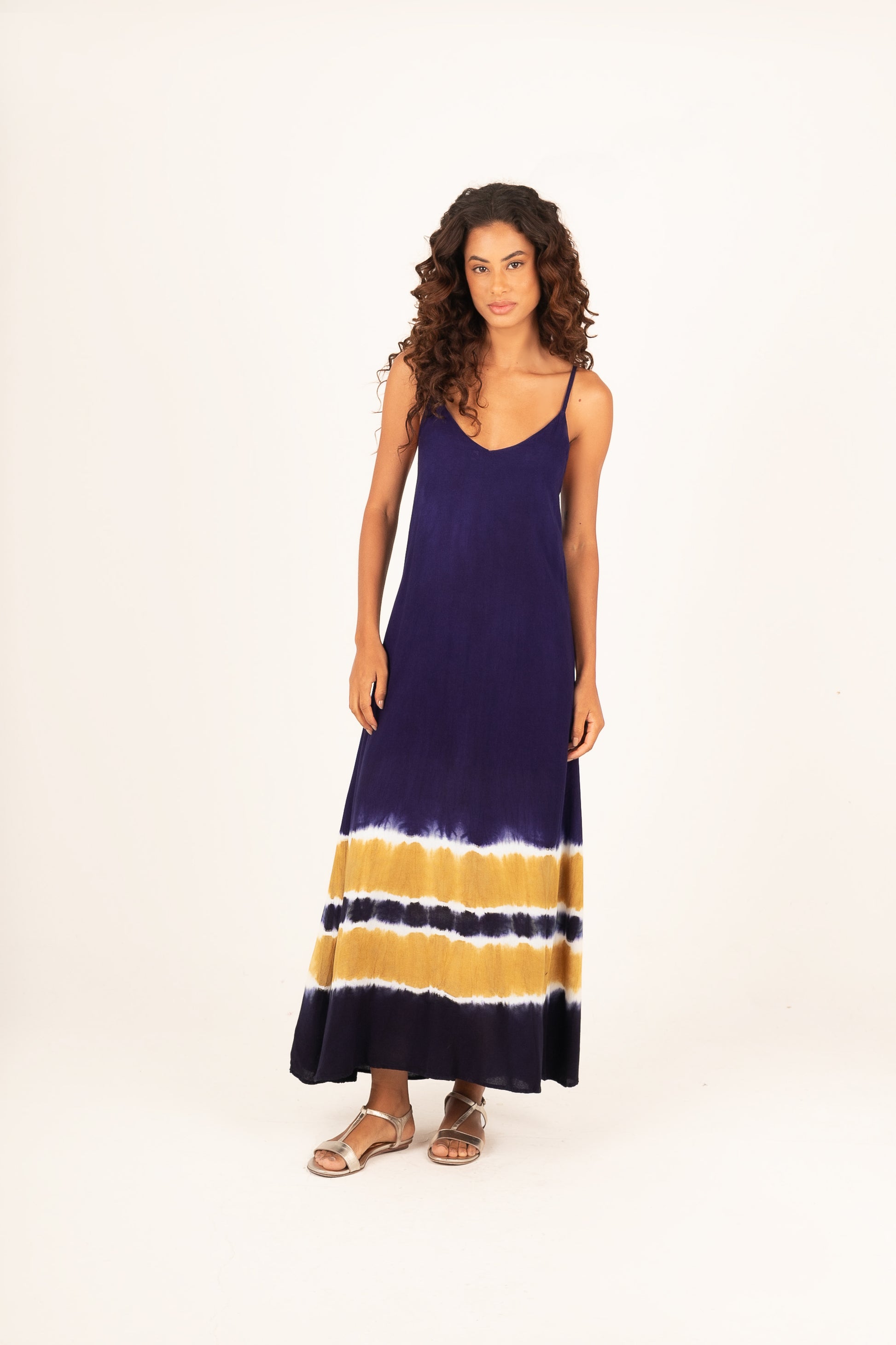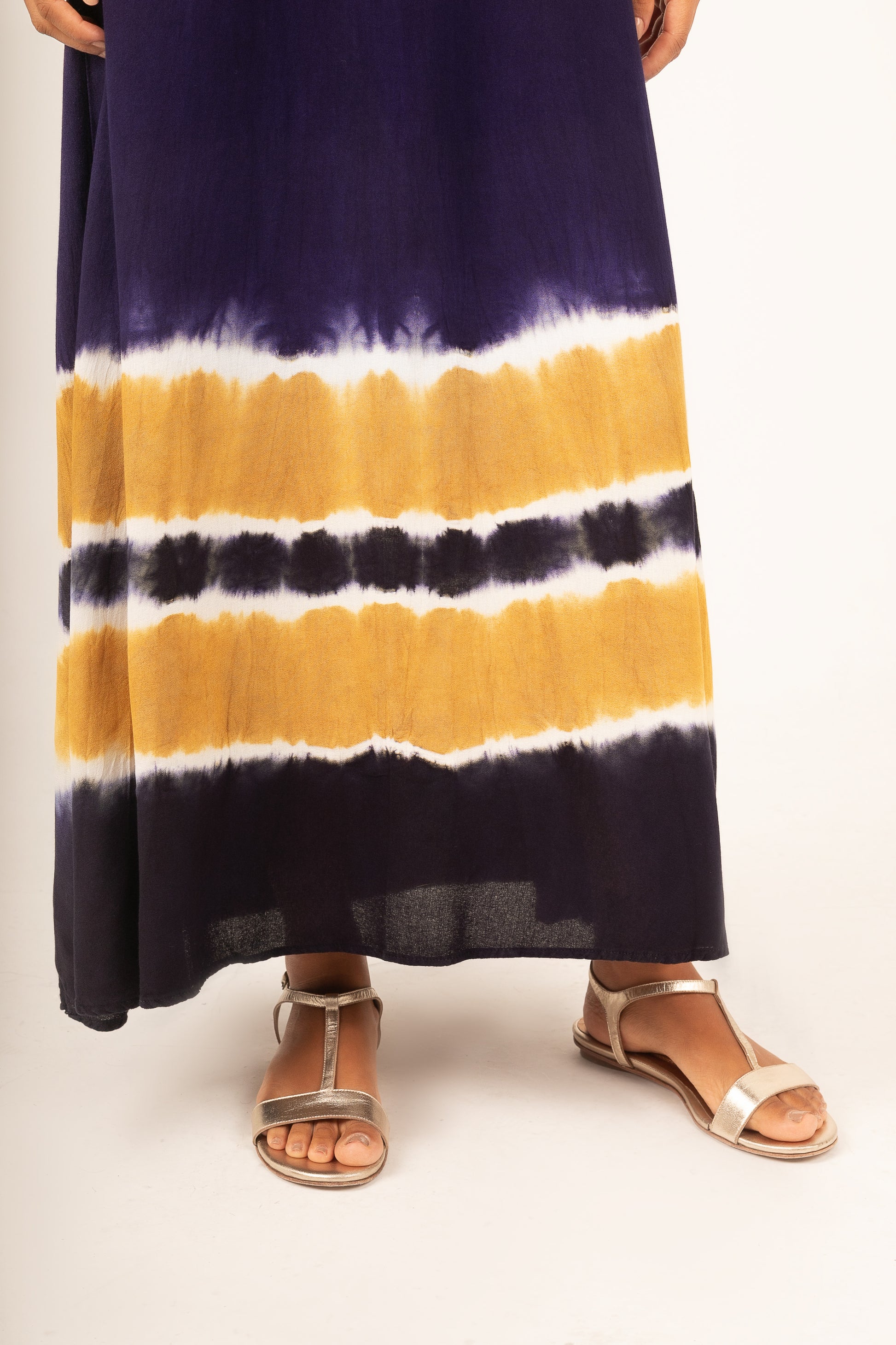 Vestido pintado à mão em Tieadye em azul marinho com listras caramelo na barra.